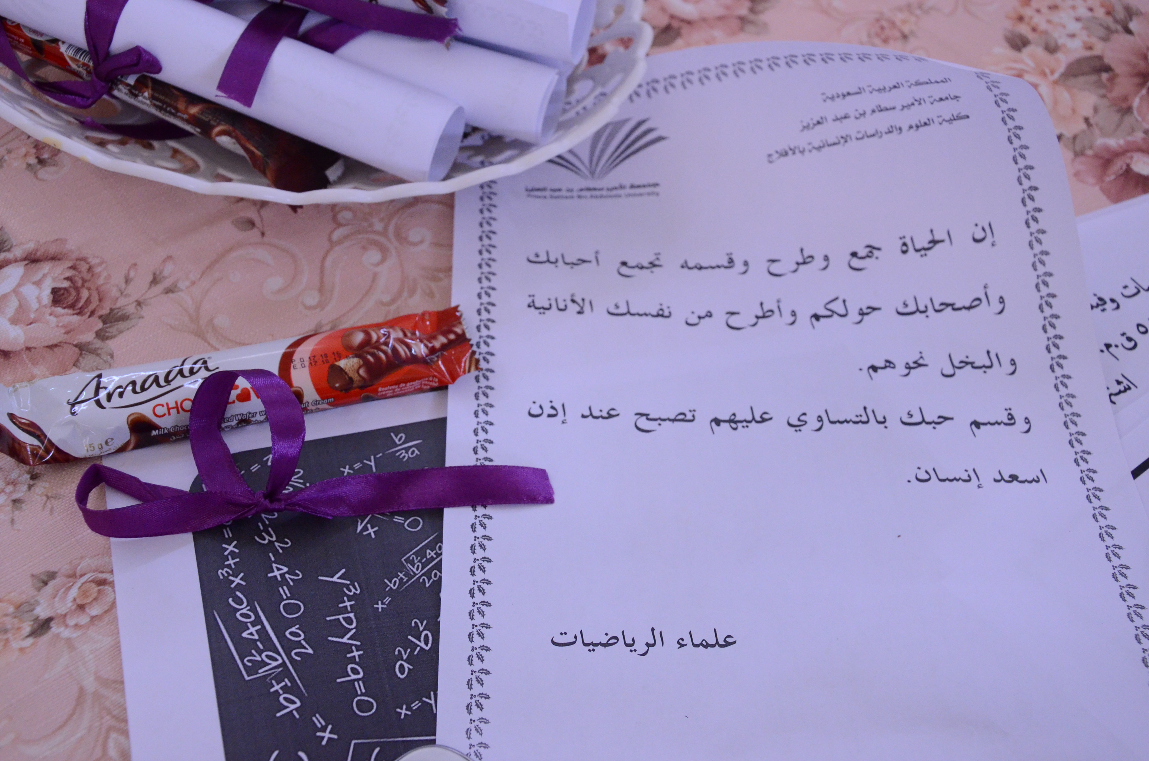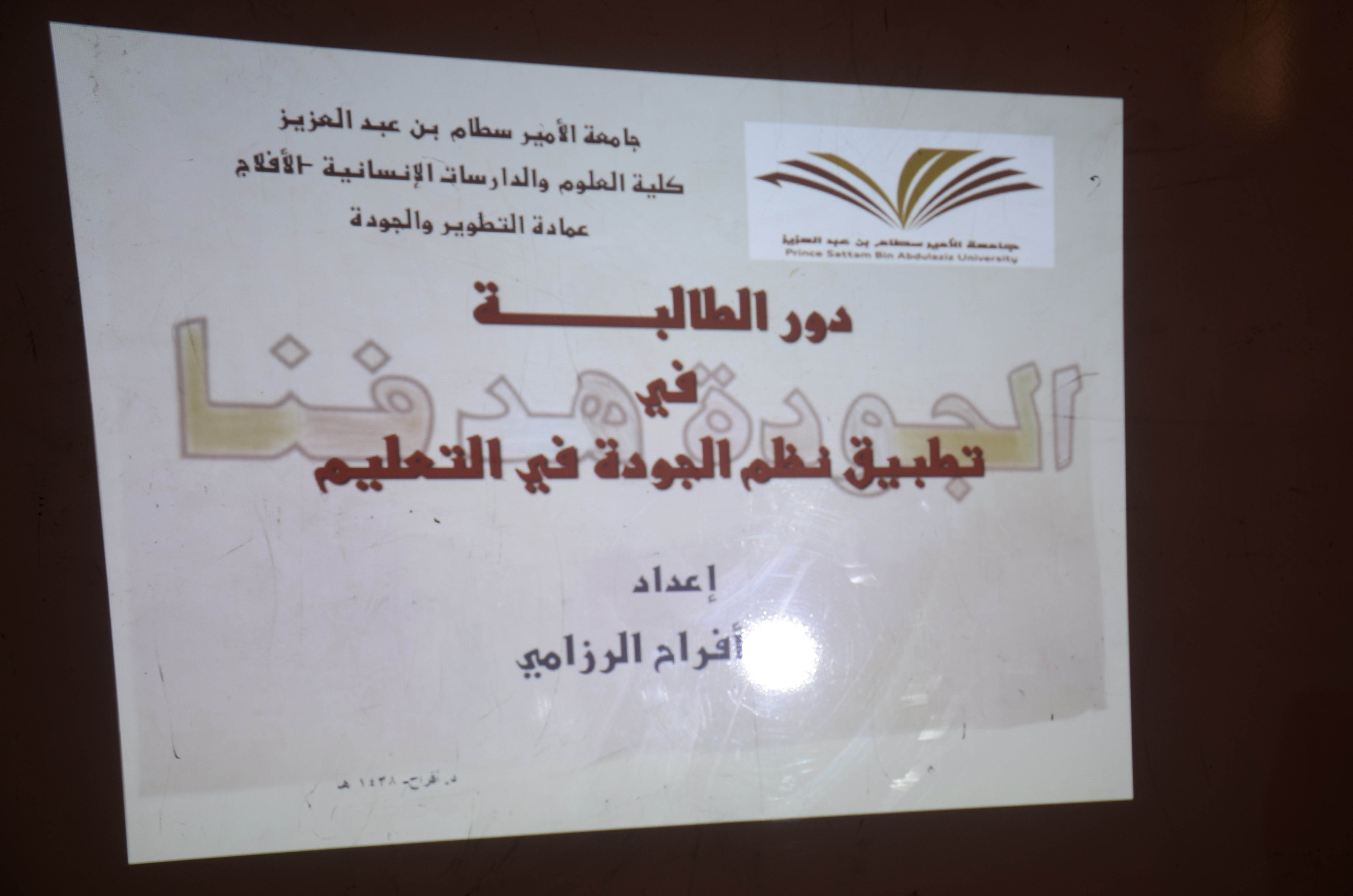 نظم نادي سيجما التابع لقسم الرياضيات بكلية العلوم والدراسات الإنسانية بالأفلاج شطر الطالبات برنامج ( دور الطالبة في تطبيق نظام الجودة في التعليم ) قدمته الدكتورة / أفراح الرزامي وذلك يوم الأحد الموافق 19/7/1438هـ ، ويهدف البرنامج إلى تعريف الطالبات بمعنى مصطلح الجودة ، وأهمية الجودة في التعليم الجامعي ومعرفة توجهات المنظمات الحديثة في مجال ضمان الجودة .