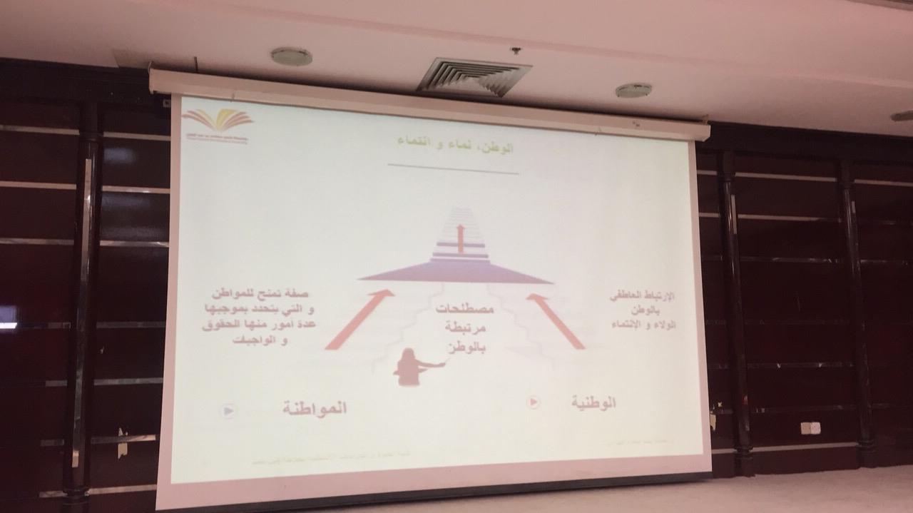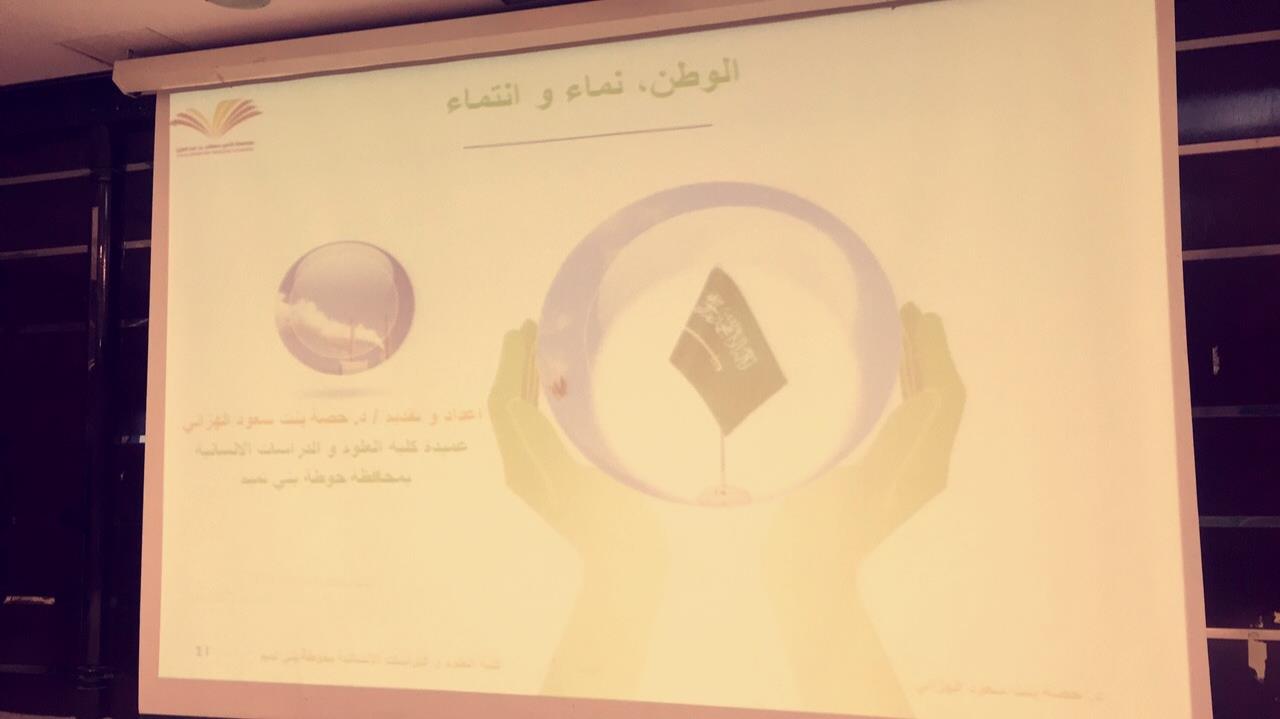 استمرارًا لفعاليات المنتدى الثقافي (معًا نرتقي) شهد مسرح "هداية" يوم الثلاثاء ١٨/ ٢/ ١٤٣٩هـ حضورًا طلابيًّا مميزًا، تضمّن فعاليات وطنية هادفة، استهلت بمحاضرة لعميدة كلية العلوم والدراسات الإنسانية بحوطة بني تميم الدكتورة حصة سعود الهزاني، تحدثت فيها عن نعمة الوطن الذي طوّقنا بجميل عطاياه، كما عرفت الوطن، ومعنى النماء والانتماء الحقيقي للوطن والفرق بينهما، وتناولت تعزيز دور الطالبات للمشاركة في المحاور، والتركيز على القيم الوطنية بالمجتمع وبنائها، وركزت كذلك على الحوار الذي به تنهض العقول، مبينةً مظاهر حب الوطن، والانتماء الحقيقي له، وكيف يستطيع كل فرد أن يغرس الولاء للوطن في نفسه وفي مجتمعه، ومن خلال نشر العلم الذي منه سيصل الوطن للقوة والعطاء، ونوهت بأن الحفاظ على ممتلكات الدولة هو محافظة على نعم الله، و شكرانه عليها لدوامها.