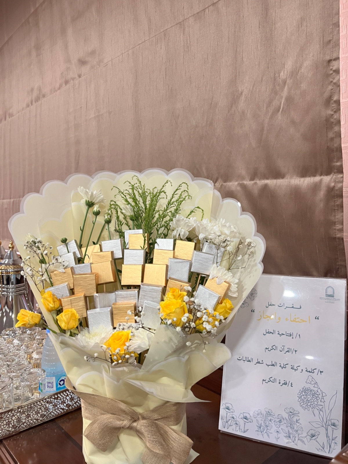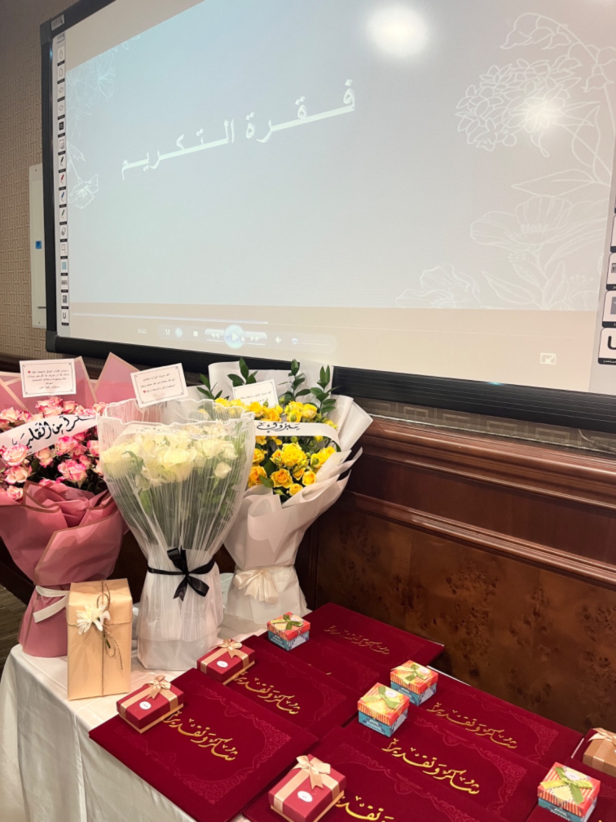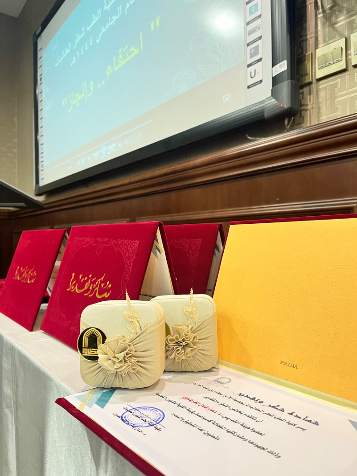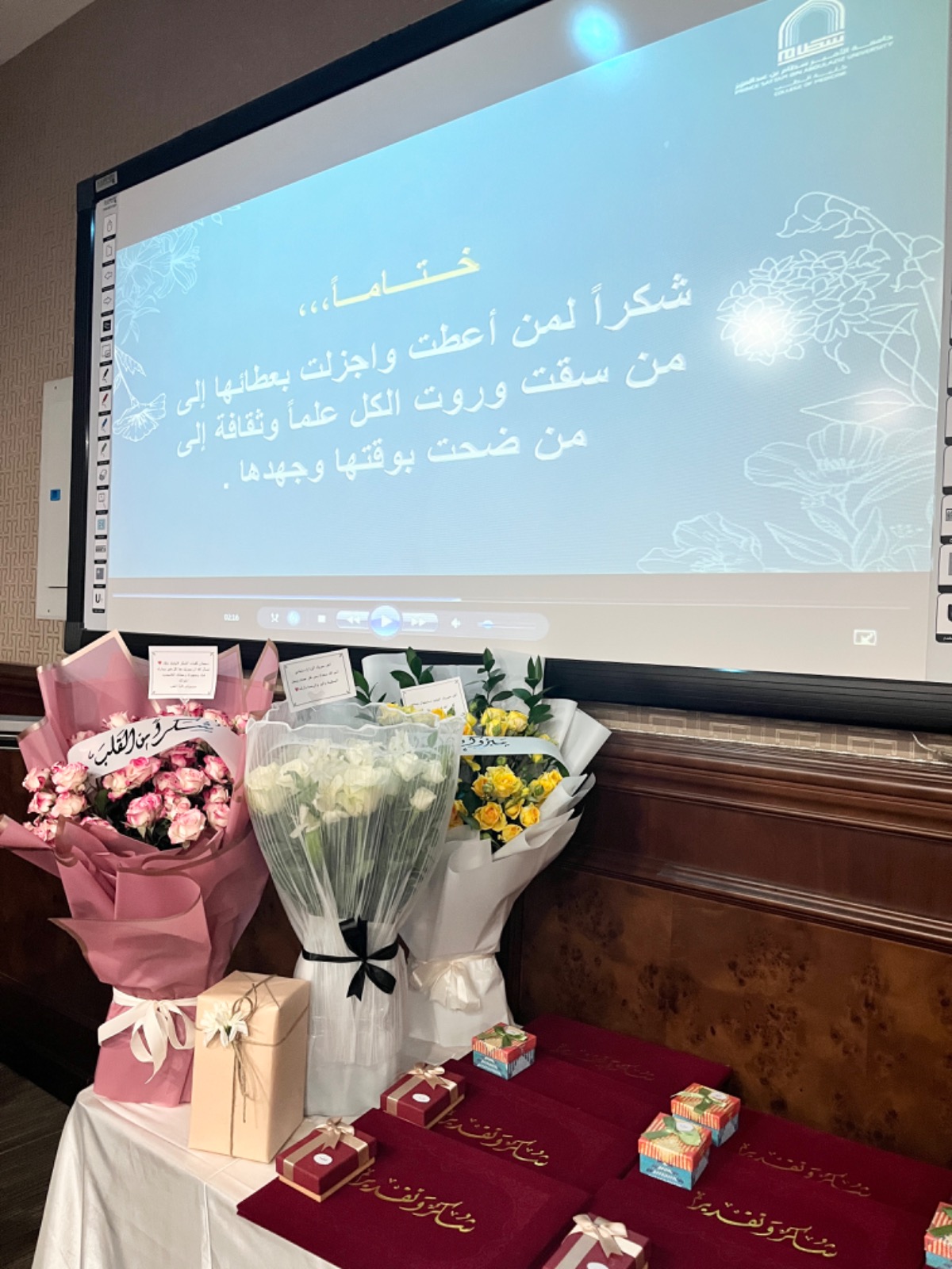 وذلك تقديراً وعرفاناً لجهودهن المبذولة خلال العام الجامعي الماضي 1444هـ حيث ابتداء الحفل بآيات من الذكر الحكيم ثم كلمة سعادة وكيلة الكلية ألقتها نيابةً عنها مديرة الإدارة ص. إسراء عبدالله العثمان . شكرت فيها الحاضرات على حضورهن وعلى ما قدمن من جهود جبارة لتوفير بيئة تعليمية تواكب تطورات التعليم الأكاديمي الحديث لتيسير العملية التعليمية بكل يسر وسهولة . بعد ذلك تم تكريم مساعدات وكيلة الكلية د. أماني ابوعوف مساعدة الوكيلة لشؤون الطالبات و د. دعاء كمال عبدالمنعم مساعدة الوكيلة لشؤون التعليمية والأكاديمية و د. أميرة فرغلي مساعدة الوكيلة لشؤون الجودة والدراسات العليا وجميع أعضاء الهيئة الإدارية من موظفات إداريات وموظفات أمن وعاملات نظافة . وتقديم لهن شهادات شكر وهدايا رمزية تقديراً لجهودهن.