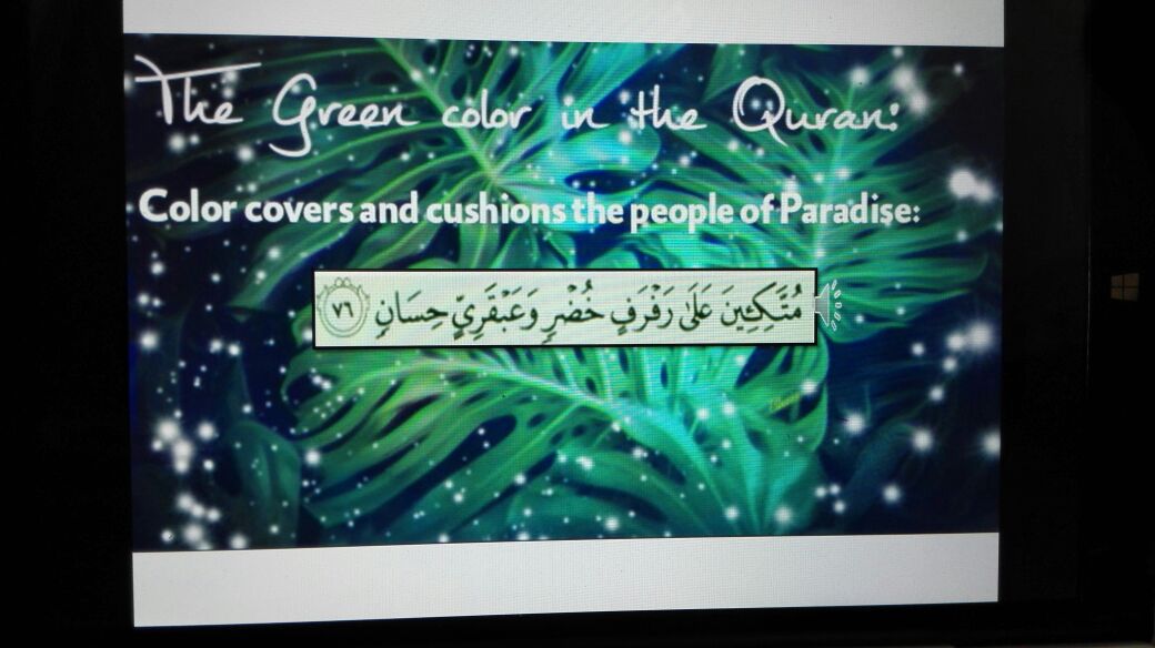 ولقد قامت الطالبات بعرض بعض آيات من القرآن الكريم اشتملت على عدد من الألوان