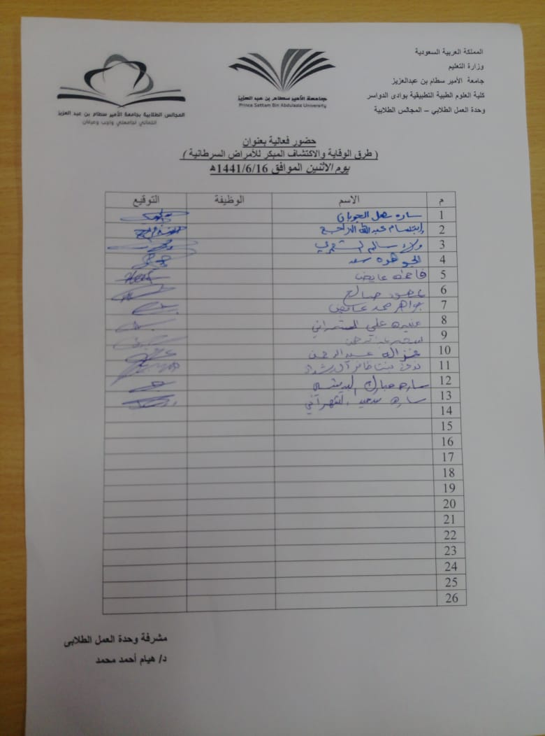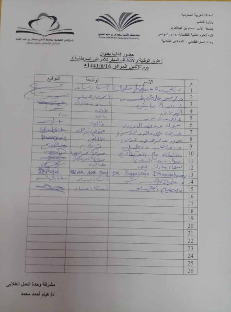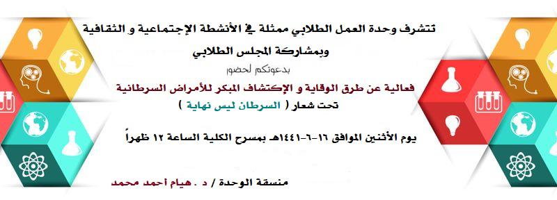 بمناسبة شهر التوعية بالأمراض السرطانية نظمت وحدة العمل الطلابي ممثلة فى الأنشطة الإجتماعية والثقافية وبمشاركة المجلس الطلابي بكلية العلوم الطبية التطبيقية وادي الدواسر فعالية عن طرق الوقاية والإكتشاف المبكر للأمراض السرطانية تحت شعار "السرطان ليس نهاية" يوم الإثنين الموافق ١٤٤١/٦/١٦ھ بمسرح كلية الآداب والعلوم بدأت الفعالية بمحاضرة عن سرطان الأطفال ألقتها د/ عطيات محمد حسن منسقة البرامج التطوعية بالكلية تناولت فيها مفهوم سرطان الأطفال- أنواعه وأعراضه - الأسباب- طرق الوقاية والإكتشاف المبكر ثم ألقت د/ هيام أحمد محمد منسقة وحدة العمل الطلابي بالكلية محاضرة عن سرطان القولون والمستقيم تناولت فيها ( التعريف بالمرض - عوامل الخطورة- الأعراض- طرق الوقاية والإكتشاف المبكر). كما قامت د/ سوجابريا داناسيجرن أستاذ مساعد بقسم المختبرات الطبية بشرح كيفية تطور الخلايا السرطانية والتغيرات الفسيولوجية المصاحبه وعوامل الخطورة متضمنه العامل الجينى وأهميته فى الأمراض السرطانية، وقامت طالبات المجلس الطلابي بالكلية بعرض مقطع صوتى تناول تجربة سابقة لسيدة تم شفاؤها من مرض السرطان، كما صاحب الفعالية ركن توعوي عن الأمراض السرطانية أعدته طالبات المجلس الطلابى يحتوى على منشورات تم توزيعها على الحضور متمنين للجميع دوام الصحة والعافية.