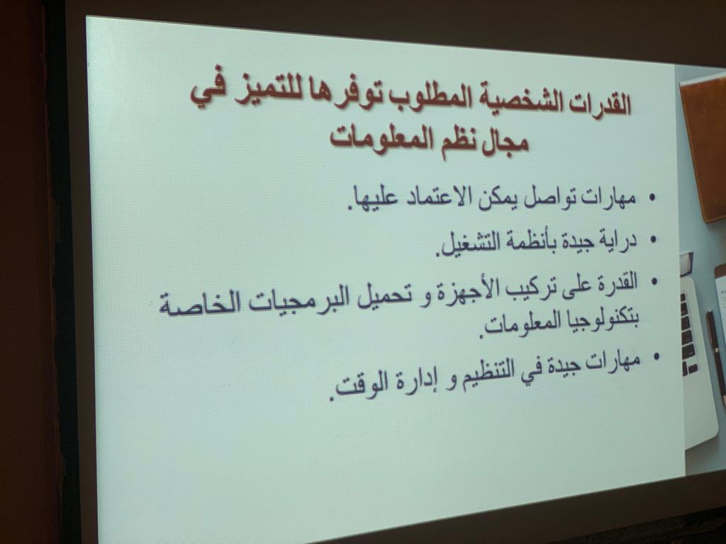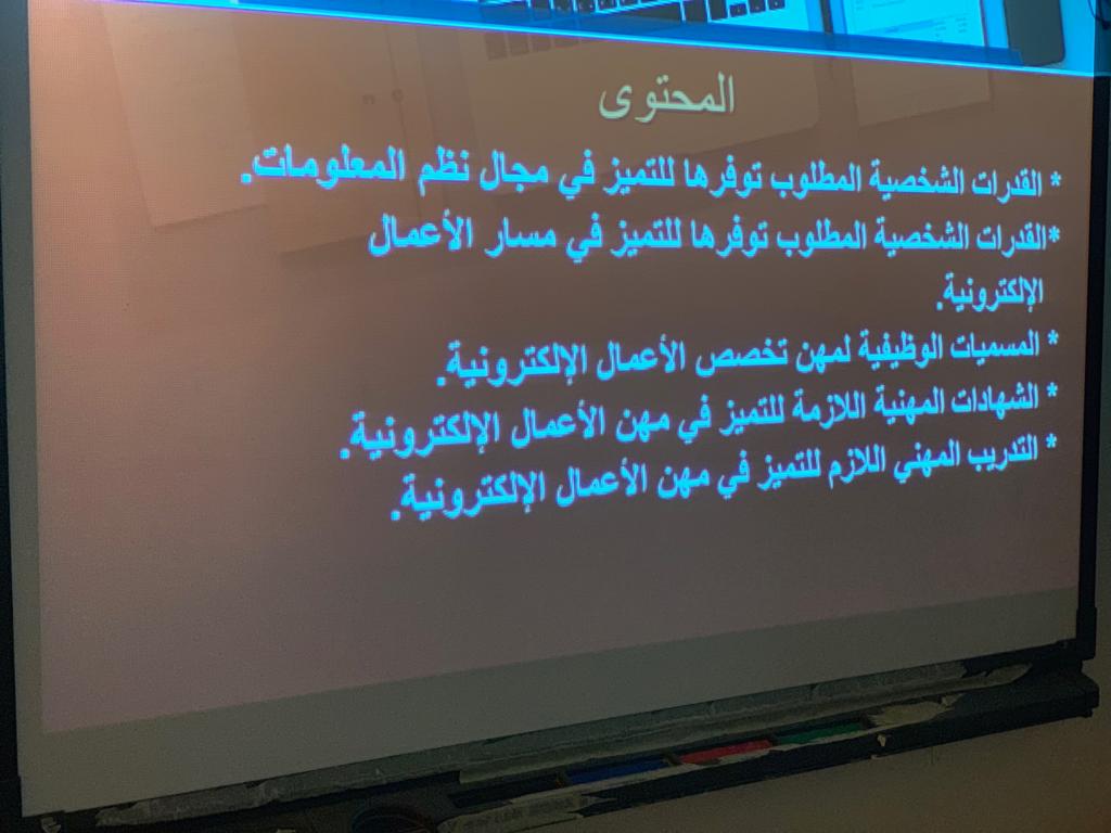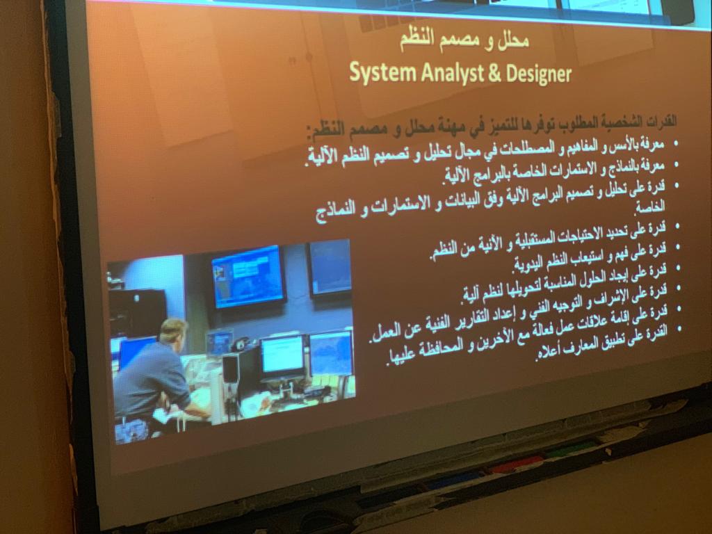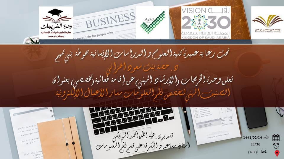 سعيا للاهتمام بمستقبل الطالبات، وفي ظل قيادة عميدة كلية العلوم و الدراسات الإنسانية بحوطة بني تميم سعادة د. حصة بنت سعود الهزاني الفاضلة، وضمن فعاليات لجنة الإرشاد المهني بوحدة الخريجات قدمت د. هبة الله أحمد الويشي الأستاذ المساعد و المشرفة على قسم نظم المعلومات فعالية : "التصنيف المهني لتخصص نظم المعلومات مسار الأعمال الإلكترونية" يوم الأحد الموافق : ١٤٤١/٢/١٤هـ بإحدى قاعات المبنى الرئيسي و بحضور (28) طالبة. بدأت الفعالية بالتعريف بالتخصص و القدرات الشخصية التي يجب توافرها في طالبات تخصص نظم المعلومات، كما تضمنت التعريف بالمسميات الوظيفية لمهن التخصص مسار الأعمال الإلكترونية و القدرات و المهارات التي تكتسبها طالبات التخصص، وقد تطرقت للشهادات المهنية التي تدعم المتخصص في مجال نظم المعلومات و التدريب المهني المصاحب لمسار الأعمال الإلكترونية. و في نهاية اللقاء فتحت الجلسة للنقاش و الرد على استفسارات الطالبات اللاتي أعربن عن تحمسهن لتنمية قدراتهن في مجال تخصص نظم المعلومات. ولقيت الفعالية تفاعلا من جميع الطالبات.