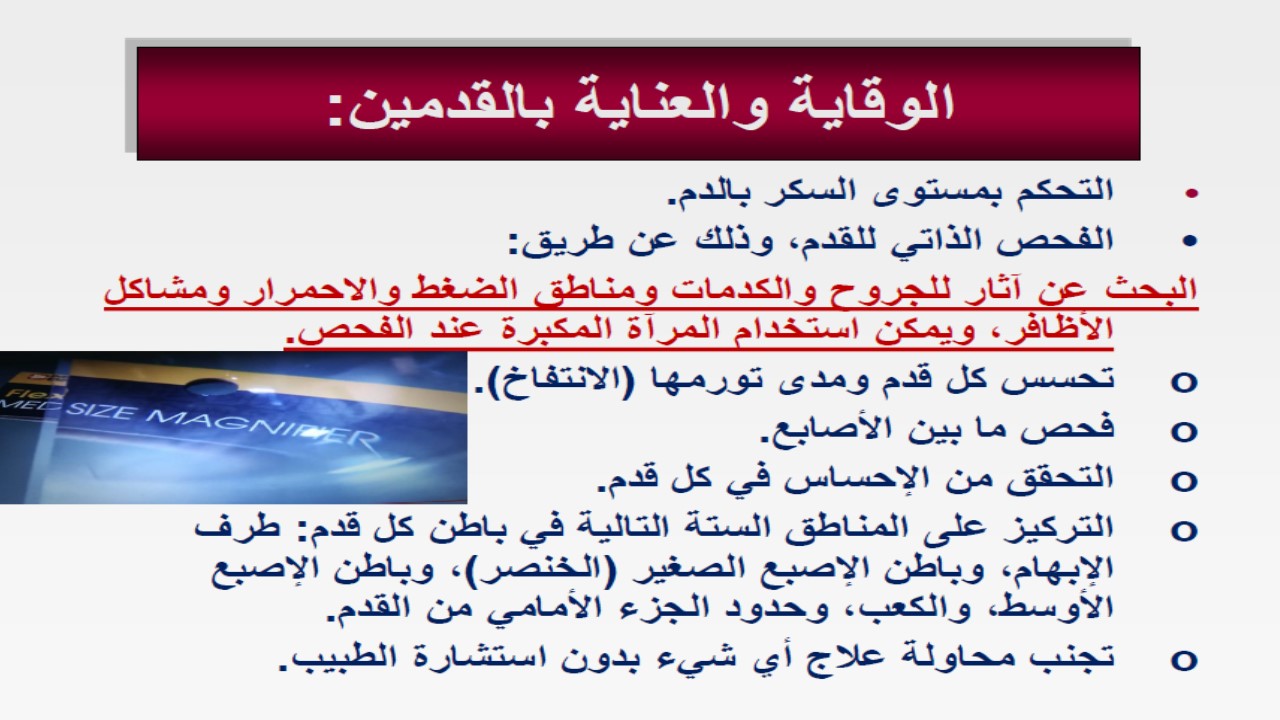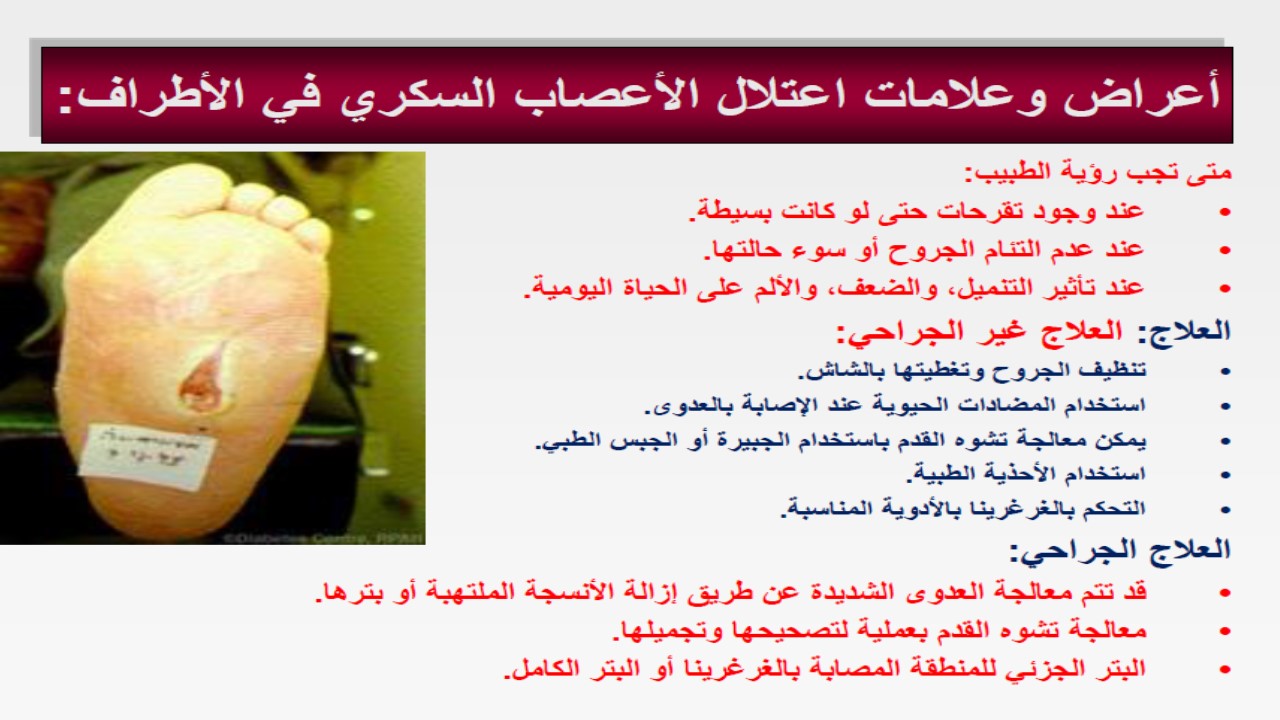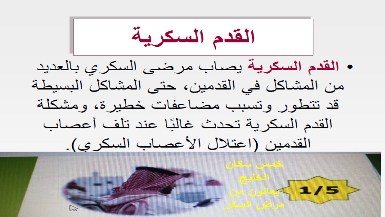 ثم تلتها محاضرة بعنوان " القدم السكري: العناية بالقدمين لمرضى السكري" قدمتها سعادة الدكتورة أزهار عبد الفتاح (مشرفة وحدة التطوير والجودة وأستاذ مساعد بالكلية) وقد أشارت سعادتها إلى تأثير السكري على القدمين و على الأوعية الدموية والأعصاب بالقدمين،معدلات الإصابة، أعراض وعلامات اعتلال الأعصاب السكري في الأطراف، الوقاية والعناية بالقدمين.