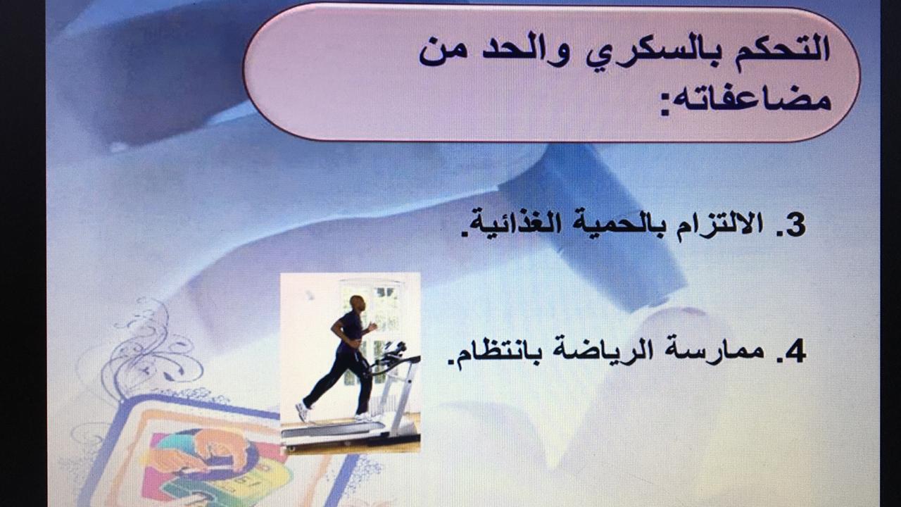 ثم تلتها محاضرة بعنوان " علاج السكري" قدمتها سعادة الدكتورة سحر علي عبد المحسن (مشرفة قسم التمريض و أستاذ مشارك بالكلية): وقد أوضحت سعادتها أهمية العلاج وتقديم إرشادات لمرضى السكري ووجود وسائل كثيرة وفعالة للسيطرة عليه والحد من المضاعفات.