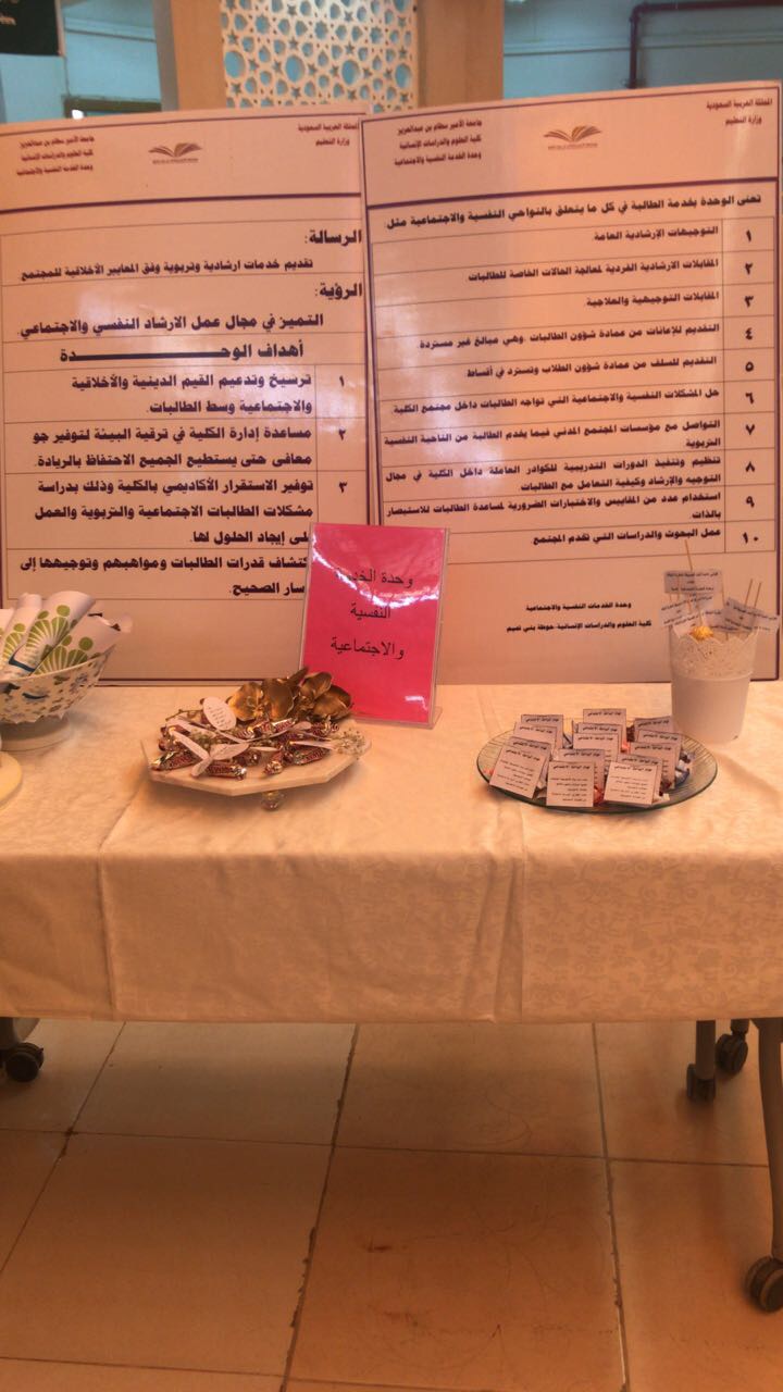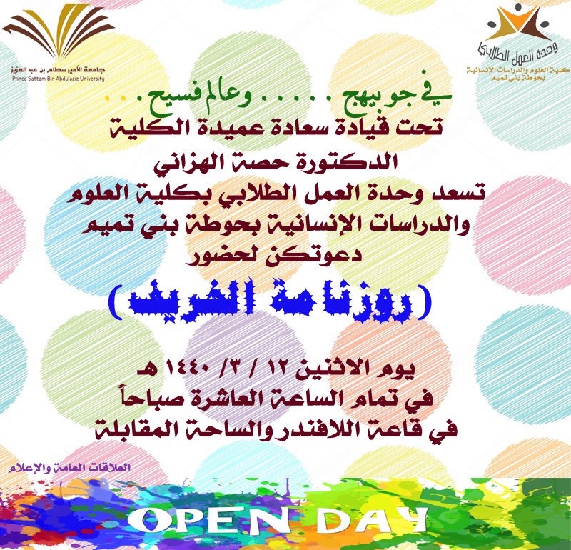 سعياً لتنمية روح الفريق الواحد بين منسوبات الكلية وللمساهمة في صقل قدرات ومهارات الطالبات وتطويرها، وبرعاية وحضور ومشاركة سعادة عميدة الكلية الدكتورة حصة بنت سعود الهزاني؛ نظمت كلية العلوم والدراسات الإنسانية بحوطة بني تميم ممثلة في وحدة العمل الطلابي بالتعاون مع وحدات وأقسام الكلية المختلفة يوماً مفتوحاً الاثنين الموافق 12 /3/ 1440 هـ لمنسوبات الكلية من أعضاء هيئة تدريس وطالبات وموظفات تحت شعار (روزنامة الخريف). حيث قامت وحدة العمل الطلابي بتعريف بوحدتها والأقسام التابعة لها من الاندية الطلابية المتمثلة بنادي اللغة الانجليزية ونادي وثبة همم ونادي القيم الطلابية ونادي الابداع وكل نادي قدم ركن يميزه. كما شاركت المجالس الطلابية بهدف التعريف بالمجلس وتقديم الألعاب التشويقية للطالبات والأعضاء. وتميزت وحدة الموهوبات بعرض مشوق لمواهب الطالبات بالرسم والتصوير أما ركن التربية وعلم النفس فجاء بعنوان أسرار الثمار حيث يتحدث عن الفواكه وأهميتها وفوائدها لجسم الانسان. (إبداع وحرف) كان شعار ركن اللغة العربية والذي يهدف إلى التعرف على العصور القديمة متل العصر العباسي والاموي ومعرفة الأشعار والقصائد المعروفة وانواع الأكل المشهورة حينها عصورهم، كما قدم بعض من الطالبات قصائد لكل عصر على حدة. وتميز ركن اللغة الانجليزية بفكرة جديدة عن دولة اليابان وانجازاتها وأشهر الاكلات الشعبية فيها. الصحة واللياقة والعادات الصحية اليومية وأنواع الأعشاب والزيوت المستخدمة للجسم والشعر والوزن المثالي للإنسان وكيفية المحافظة عليه كانت من ضمن أفكار ركن قسم الكيمياء. كما ركز ركن قسم نظم المعلومات الذي يهدف إلى التعرف على المواقع الإلكترونية الجيدة والتطبيقات الجوال للاستفادة منها في الحياة العلمية والعملية. قسم الرياضيات قدم تعريف بالألعاب الرياضية للترويح عن النفس باستخدام الألعاب تحفز العقل وتنشطه. أما قسم الدراسات الإسلامية قدم ركن بعنوان شتاء دافئ الذي يهدف إلى إبراز خصائص فصل الشتاء والعادات المتبعة في الفصل من تناول المأكولات والمشروبات. كما قدمت وحدات الكلية أركان تعريفية لكل وحدة متمثلة بتعريف كل وحدة وأهدافها ورؤية ورسالتها والاعمال الموكلة بها.