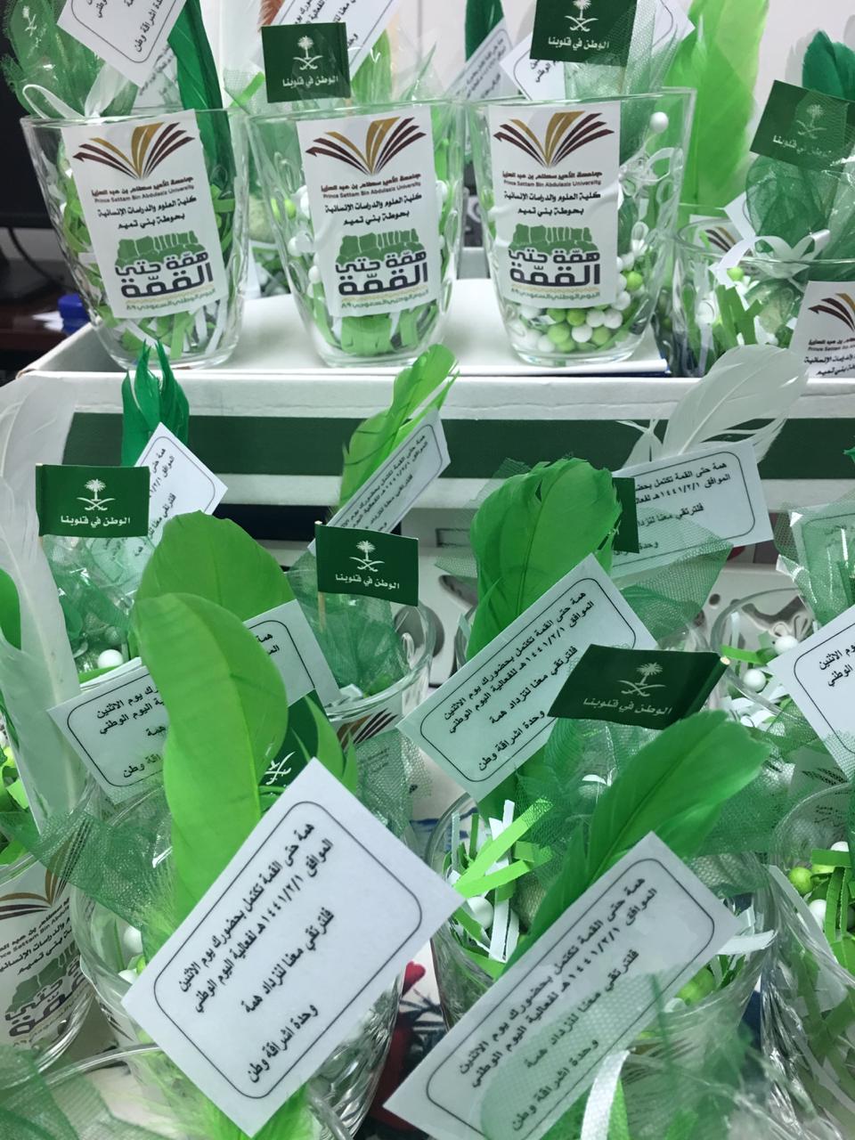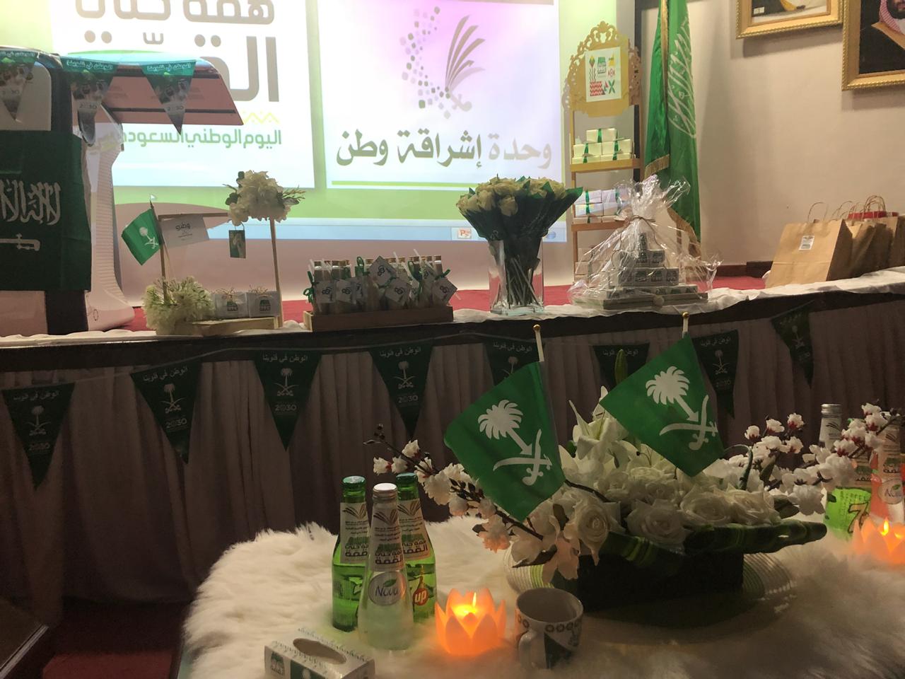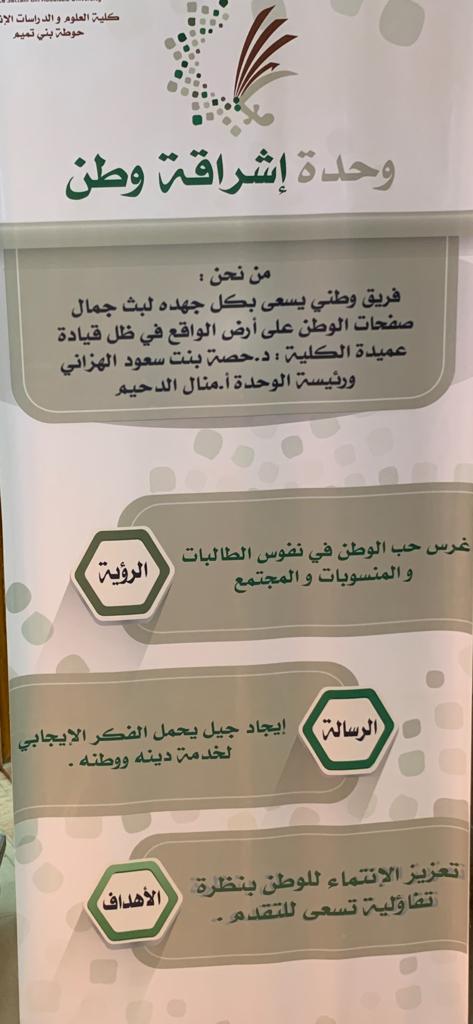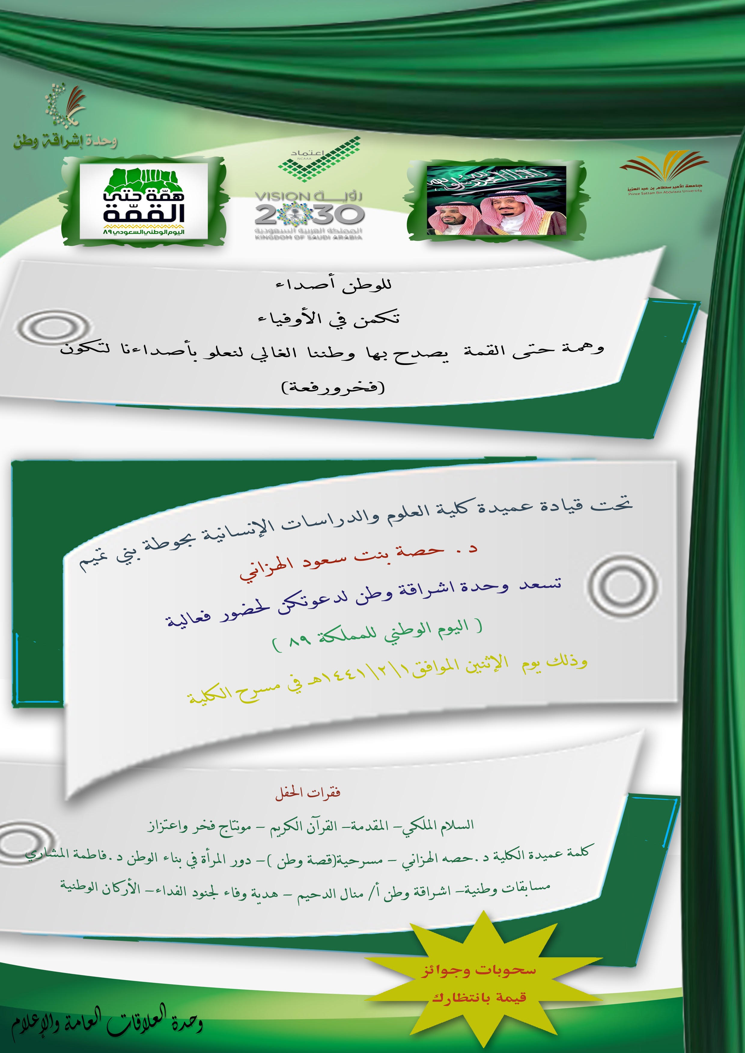 في يوم بهيج يسطع للدنيا نور الذكرى التاسع والثمانون لتأسيس المملكة العربية السعودية، ليكون حقًا لكل مواطن الفخر والعزة بهذا التأسيس. ليسطع خفاقًا في قلوب كل مواطنة تقبع هذه الأرض الرحبة؛ لتضج الدعوات بحضور فعالية الفخر بهذا الوطن المعطاء؛ فتحلق الإعلام خفاقة في كلية العلوم والدراسات الإنسانية بحوطة بني تميم في يوم الاثنين الموافق ١٤٤١/٢/١هـ وبتمام الساعة ٩:30 صباحا حيث انطلقت الفعالية من وحدة إشراقة وطن تحت قيادة عميدة الكلية د. حصه بنت سعود الهزاني حيث ارتدى المسرح اللون الأخضر والأبيض مدويا نحن "همة حتى القمه "، ليبدأ البرنامج بالسلام الملكي باللغة العربية واللغة الإنجليزية ومن ثم قدمت الطالبة هديل الرقدي مقدمة فيها الحمد والثناء والبهجة والبهاء، ليتبعها مونتاج يحكي همة حتى القمة، ومن بعده تقدمت عميدة الكلية بكلمتها التي بينت فيها أهمية هذه المناسبة وأننا كلنا للوطن وفخرنا اليوم لا يعادله فخر وعلينا أن نقدم ما في وسعنا لخدمة الدين والوطن، ومن ثم بدأت مسرحية قصة وطن تحكي ما وصل له الوطن من تقدم وعلو، ومن بعدة كلمة بعنوان "دور المرأة في بناء الوطن" قدمتها د. فاطمه المشاري حيث ركزت على نماذج المرأة في العصر القديم والحديث والدور الذي قدمته. بعدها تقدمت طالبة تحكي مشاعرها للوطن، وسما الحفل بمسابقات وطنية أضفت روح الثقافة والمرح على الحاضرات وفِي موجات الفعالية وقفت وحدة إشراقة وطن بإشراف أ/ منال الدحيم على الجنود البواسل الذين يبقى ذكرهم ووهجهم في كل حين لنفخر بشهدائهم ونقدم لهم هدية وفاء لجنود الفداء وهو وقف دعوي. لتتقدم في ختام الفعالية عميدة الكلية بمناسبة اليوم الوطني بسحوبات وجوائز قيمة أثارت الحماس في نفوس الطالبات ولمس الأثر عليهن واختتم البرنامج بهدايا من إشراقة وطن لشركاء النجاح من جميع أقسام الكلية والنوادي والمجالس الطلابية والعلاقات العامة. وتم الانطلاق للمعرض المصاحب للفعالية حيث توسم بوشاح الفخر من طالبات القمه وتواقيع بصمت أجمل معاني حب الوطن. ولم يكن المحيط الخارجي للكلية مجهولاً في هذا اليوم بل كانت الهدايا الوطنية لأولياء الأمور مرسمًا ومعلما لهذا اليوم.