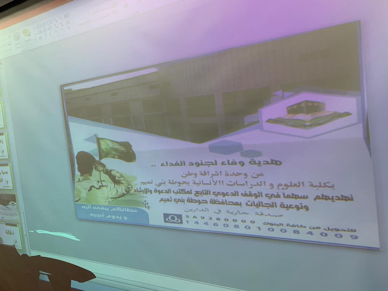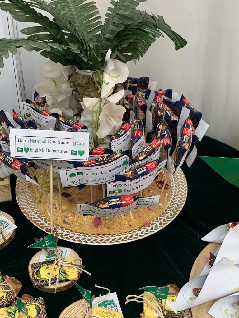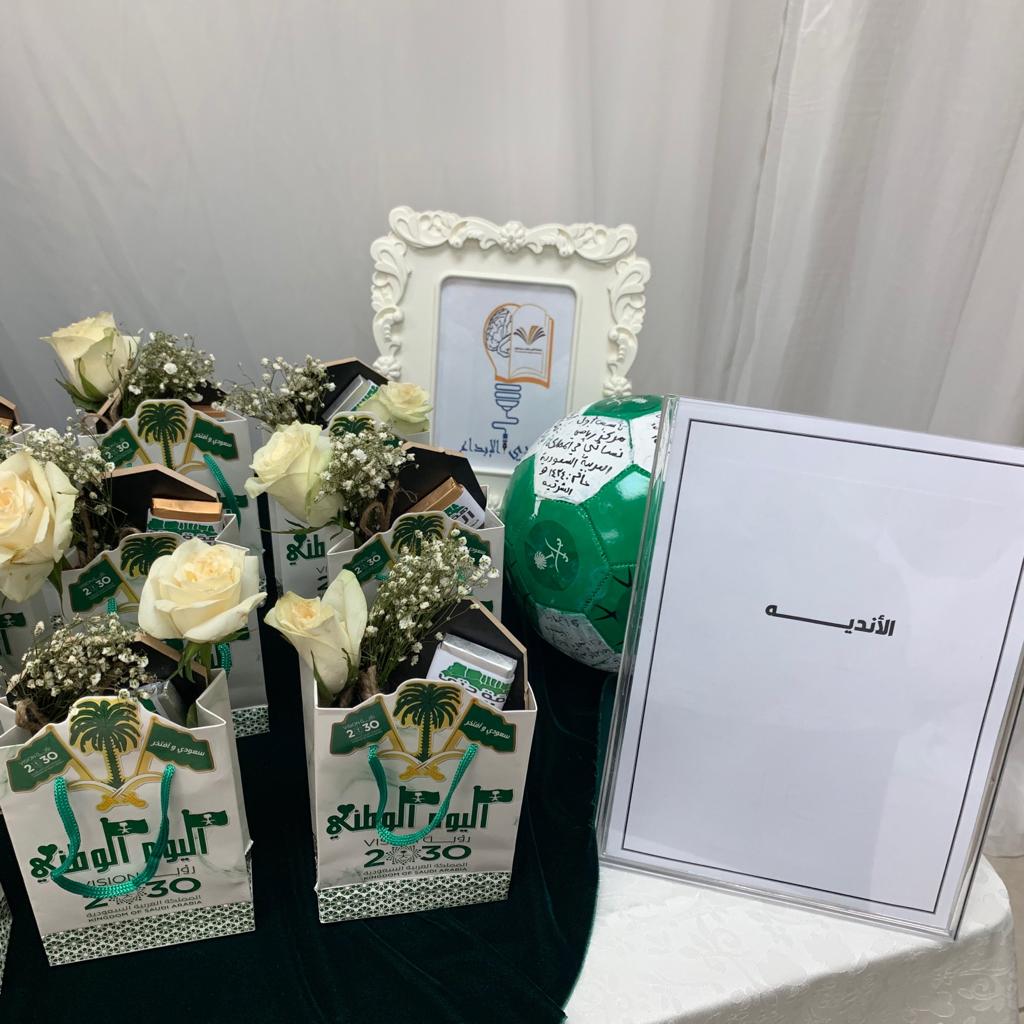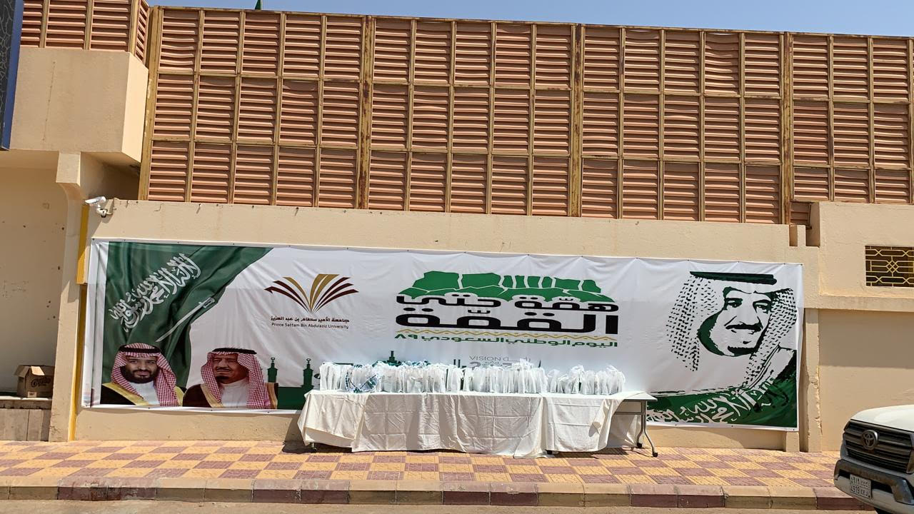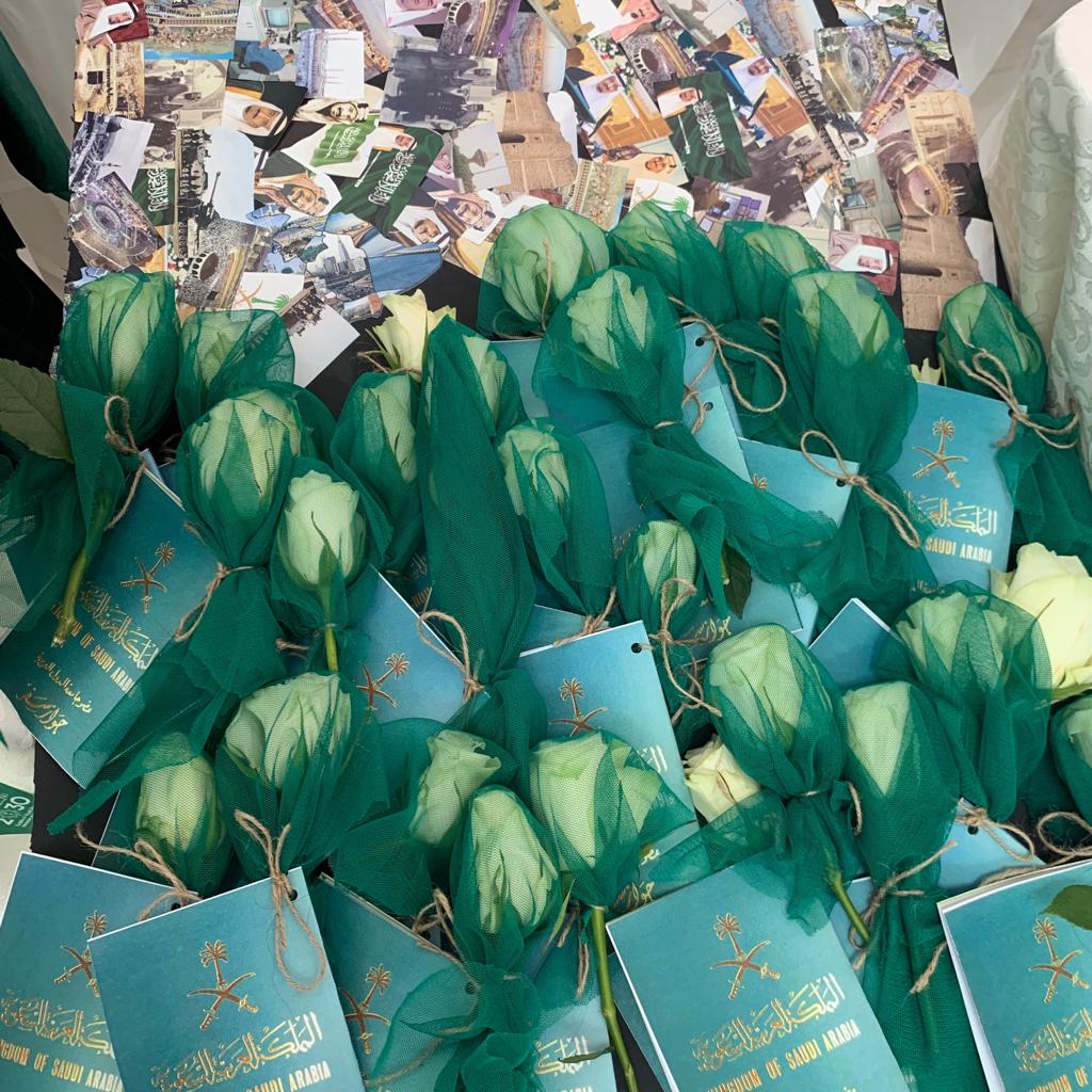 في يوم بهيج يسطع للدنيا نور الذكرى التاسع والثمانون لتأسيس المملكة العربية السعودية، ليكون حقًا لكل مواطن الفخر والعزة بهذا التأسيس. ليسطع خفاقًا في قلوب كل مواطنة تقبع هذه الأرض الرحبة؛ لتضج الدعوات بحضور فعالية الفخر بهذا الوطن المعطاء؛ فتحلق الإعلام خفاقة في كلية العلوم والدراسات الإنسانية بحوطة بني تميم في يوم الاثنين الموافق ١٤٤١/٢/١هـ وبتمام الساعة ٩:30 صباحا حيث انطلقت الفعالية من وحدة إشراقة وطن تحت قيادة عميدة الكلية د. حصه بنت سعود الهزاني حيث ارتدى المسرح اللون الأخضر والأبيض مدويا نحن "همة حتى القمه "، ليبدأ البرنامج بالسلام الملكي باللغة العربية واللغة الإنجليزية ومن ثم قدمت الطالبة هديل الرقدي مقدمة فيها الحمد والثناء والبهجة والبهاء، ليتبعها مونتاج يحكي همة حتى القمة، ومن بعده تقدمت عميدة الكلية بكلمتها التي بينت فيها أهمية هذه المناسبة وأننا كلنا للوطن وفخرنا اليوم لا يعادله فخر وعلينا أن نقدم ما في وسعنا لخدمة الدين والوطن، ومن ثم بدأت مسرحية قصة وطن تحكي ما وصل له الوطن من تقدم وعلو، ومن بعدة كلمة بعنوان "دور المرأة في بناء الوطن" قدمتها د. فاطمه المشاري حيث ركزت على نماذج المرأة في العصر القديم والحديث والدور الذي قدمته. بعدها تقدمت طالبة تحكي مشاعرها للوطن، وسما الحفل بمسابقات وطنية أضفت روح الثقافة والمرح على الحاضرات وفِي موجات الفعالية وقفت وحدة إشراقة وطن بإشراف أ/ منال الدحيم على الجنود البواسل الذين يبقى ذكرهم ووهجهم في كل حين لنفخر بشهدائهم ونقدم لهم هدية وفاء لجنود الفداء وهو وقف دعوي. لتتقدم في ختام الفعالية عميدة الكلية بمناسبة اليوم الوطني بسحوبات وجوائز قيمة أثارت الحماس في نفوس الطالبات ولمس الأثر عليهن واختتم البرنامج بهدايا من إشراقة وطن لشركاء النجاح من جميع أقسام الكلية والنوادي والمجالس الطلابية والعلاقات العامة. وتم الانطلاق للمعرض المصاحب للفعالية حيث توسم بوشاح الفخر من طالبات القمه وتواقيع بصمت أجمل معاني حب الوطن. ولم يكن المحيط الخارجي للكلية مجهولاً في هذا اليوم بل كانت الهدايا الوطنية لأولياء الأمور مرسمًا ومعلما لهذا اليوم.