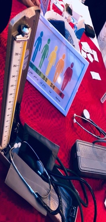 الركن الأول وهو ما يخص قسم التمريض ويحتوي على جهاز لقياس السكري والضغط وركن التثقيف الصحي عن السكري والحمية وأهمية متابعة السكري وضغط الدم والغذاء المناسب لمرضى ضغط الدم وأهمية فيتامين د ومصادر توفره وركن للمطويات والمنشورات والبروشورات للحضور وضيافة للحضور