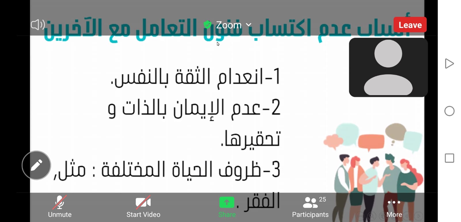 يوم الاثنين الموافق1443/2/27هـ الساعة 8 م ، وذلك بإشراف وتنظيم أ. زهراء علي عبد الله، وبحضور منسوبات العمادة وطالباتها. في هذه الفعالية تحدثت الطالبات عن تعريف فنون التعامل مع الآخرين وطرقها، كما تناولن القواعد التي يقوم عليها التواصل مع الآخرين وعرضن أسباب عدم التعامل مع الآخرين. وهدفت هذه الفعالية الى: