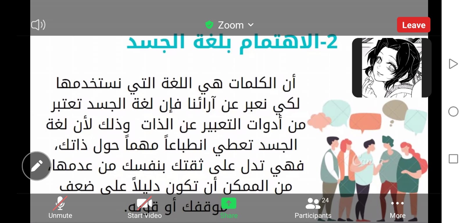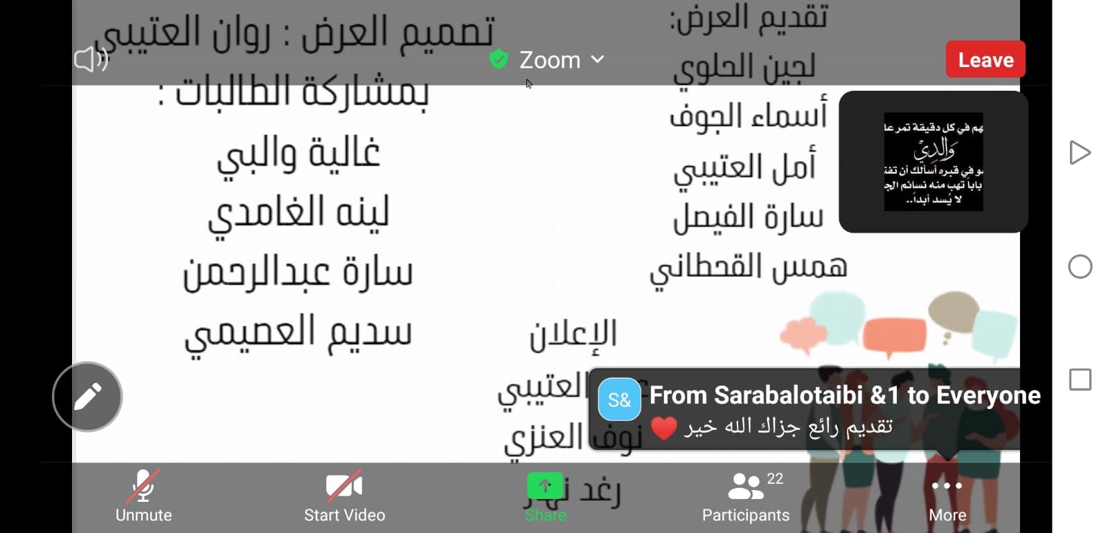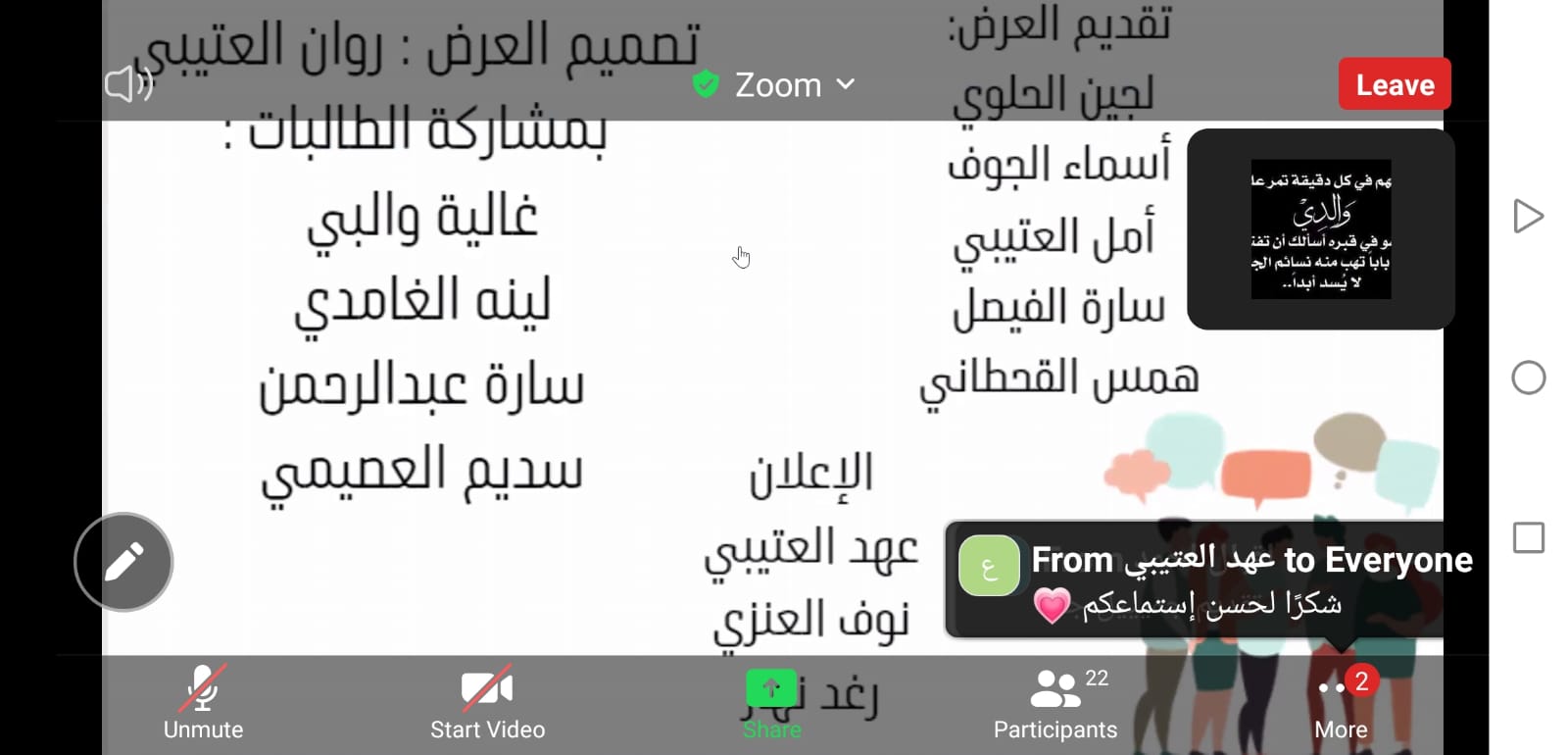 وختاما شكرت أ. زهراء علي الحضور وأشادت بما قدمته الطالبات طرح الموضوع بصورة جميلة ورائعة.