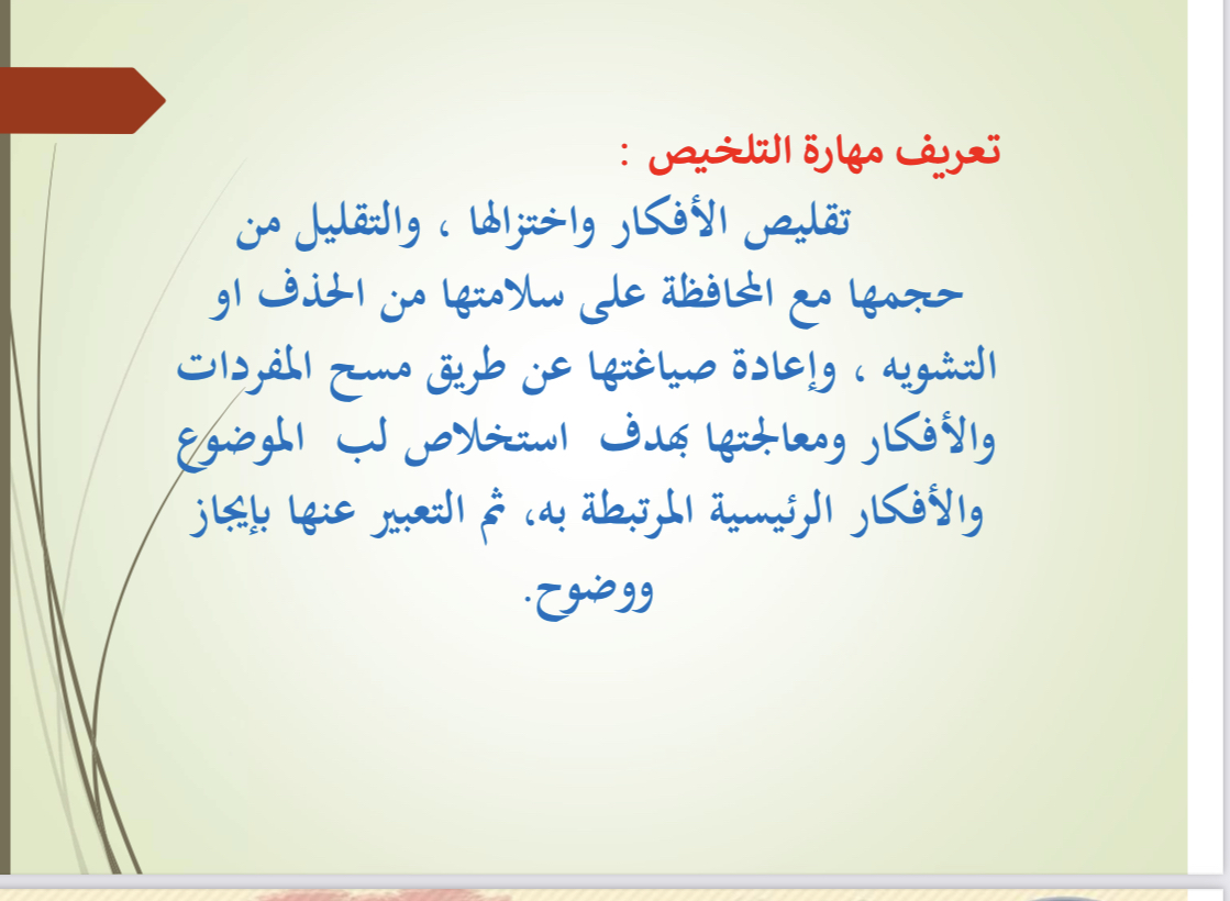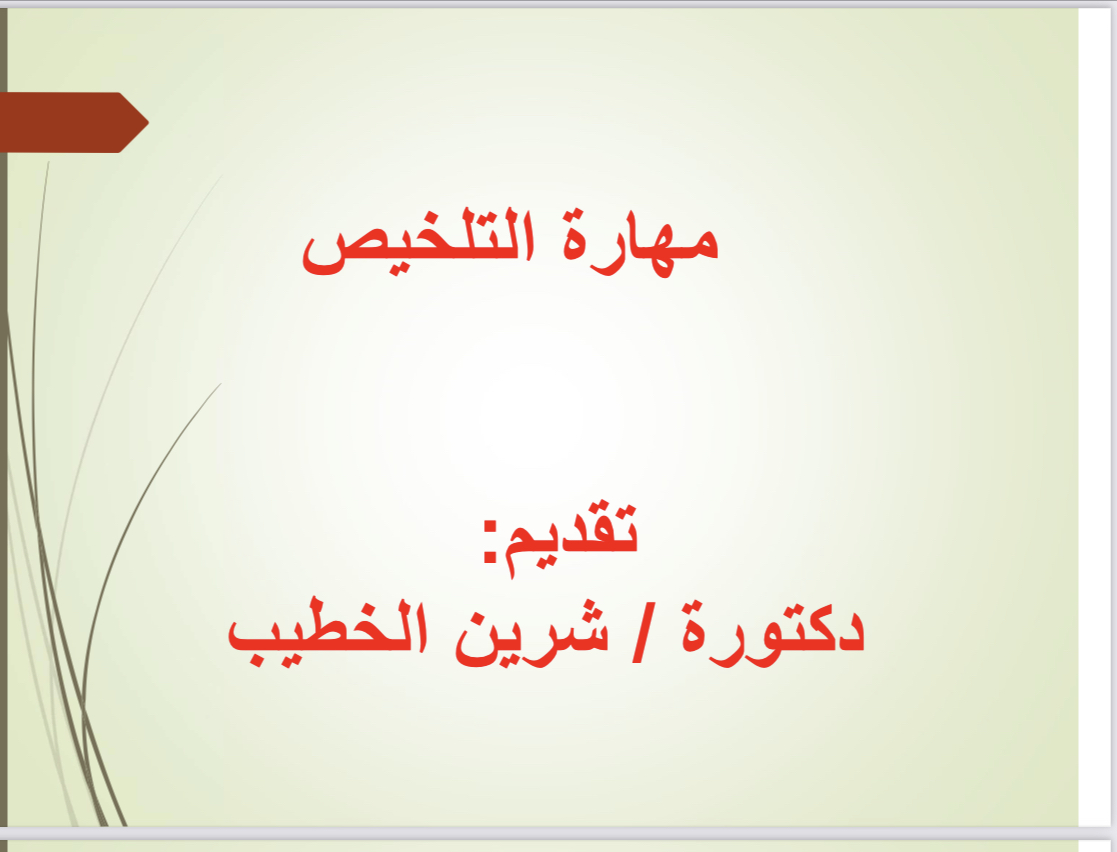 قدمت الورشة د. شرين الخطيب الأستاذ المساعد بقسم اللغة العربية. وقد أعطت فكرة واضحة عن مهارة التلخيص من خلال عرض المعلومات المتعلقة بأهداف الورشة بصورة شيقة وممتعة