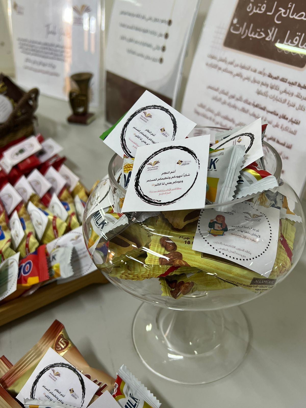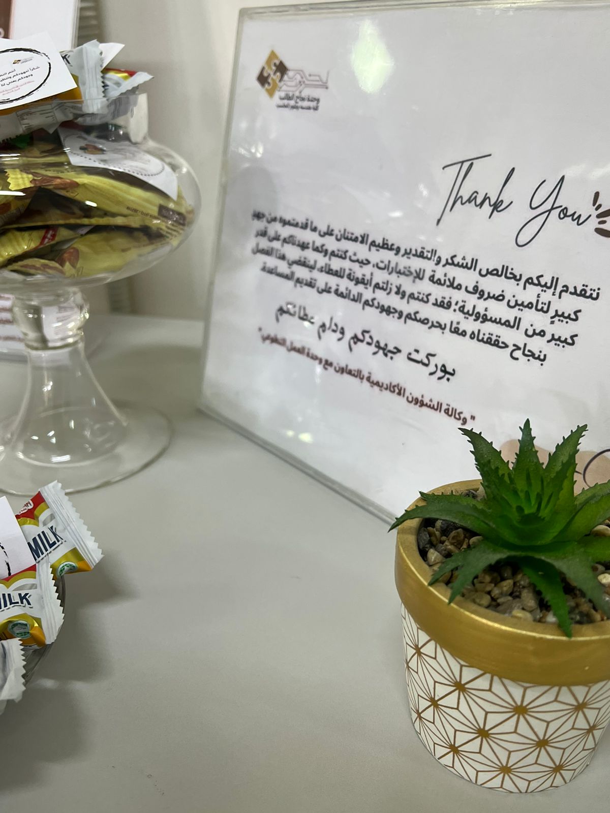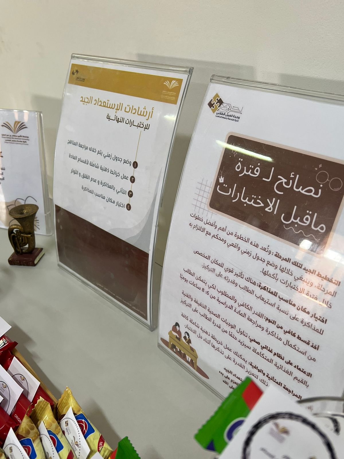 حيث قامت طالبات الوحدة بتجهيز بوسترات وملصقات تحتوي على عبارات تحفيزية وتشجيعية لزميلاتهم وطرق التجهيزالأمثل للاختبارات. وقد تمت مشاركة الملصقات حتى تطلع عليها الطالبات. ومن جهة اخرى جهزت طالبات الوحدة بوستر وملصق يحتوي على عبارات شكر للجنة الاختبارات وعضوات هيئة التدريس عرفاناُ بالجميل لجهودهم الطيبة في حسن سير الاختبارات .