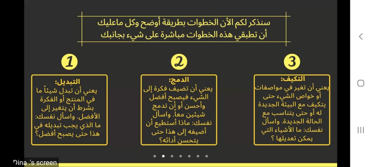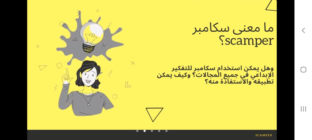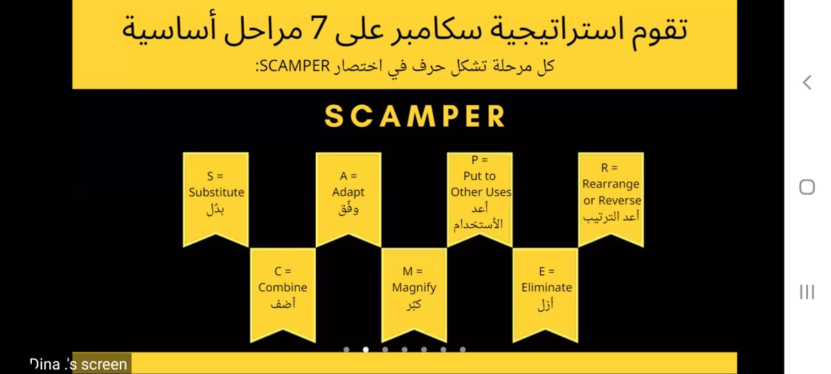 يعد للتفكير الابداعي اثر كبير على الفرد فهو يمكنه من المشاركة والتفاعل بشكل إيجابي وما لذلك من اثر وانعكاس على شخصيته واكسابه مهارة إدارة المواقف وسرعة التعامل معها، وللمساعدة على النظر خارج الصندوق و تقديم نظرة جديد للحياة، أقامت وحدة العمل التطوعي بعمادة السنة التحضيرية – قسم الطالبات فعالية بعنوان " scamper"، وذلك يوم الخميس الموافق 1443/3/8هـ،بحضور منسوبات وطالبات العمادة. حيث بدأ العرض بشرح لمعنى التفكير الإبداعي وأهمية على الفرد والمجتمع، كما تضمن اللقاء شرح تفصيلي لاستراتيجية scamper وما يقدمه من زيادة مهارات التفكير الإبداعي وتوضيح لكيفية تطبيقه واستخدام أدواته وطريقة عملها، حيث حازت الفعالية رضا واستحسان الحضور.