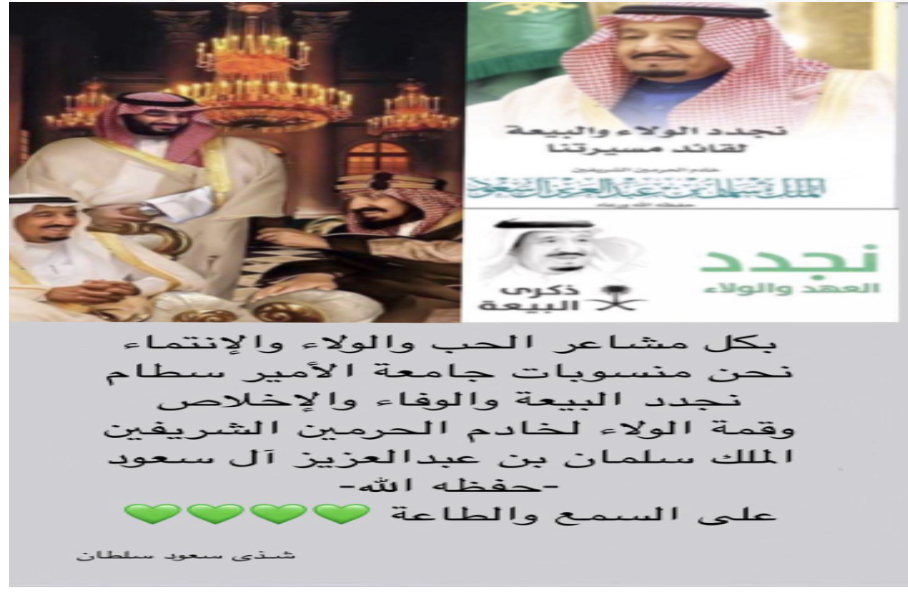 واختتم الحفل بتقديم أسمى عبارات الولاء والطاعة والمبايعة لخادم الحرمين الشريفين الملك سلمان ، حضر الفعالية جمع كبير من عضوات هيئة التدريس والطالبات بمختلف أقسام الكلية ، وعبر الجميع عن تفاعله مع كل الفقرات حيث أرسلوا عبارات البيعة والولاء للملك حفظه الله عبر الشات الموجود بالفعالية ، وسط هذه الأجواء المعبرة عن الاحتفال بهذه المناسبة