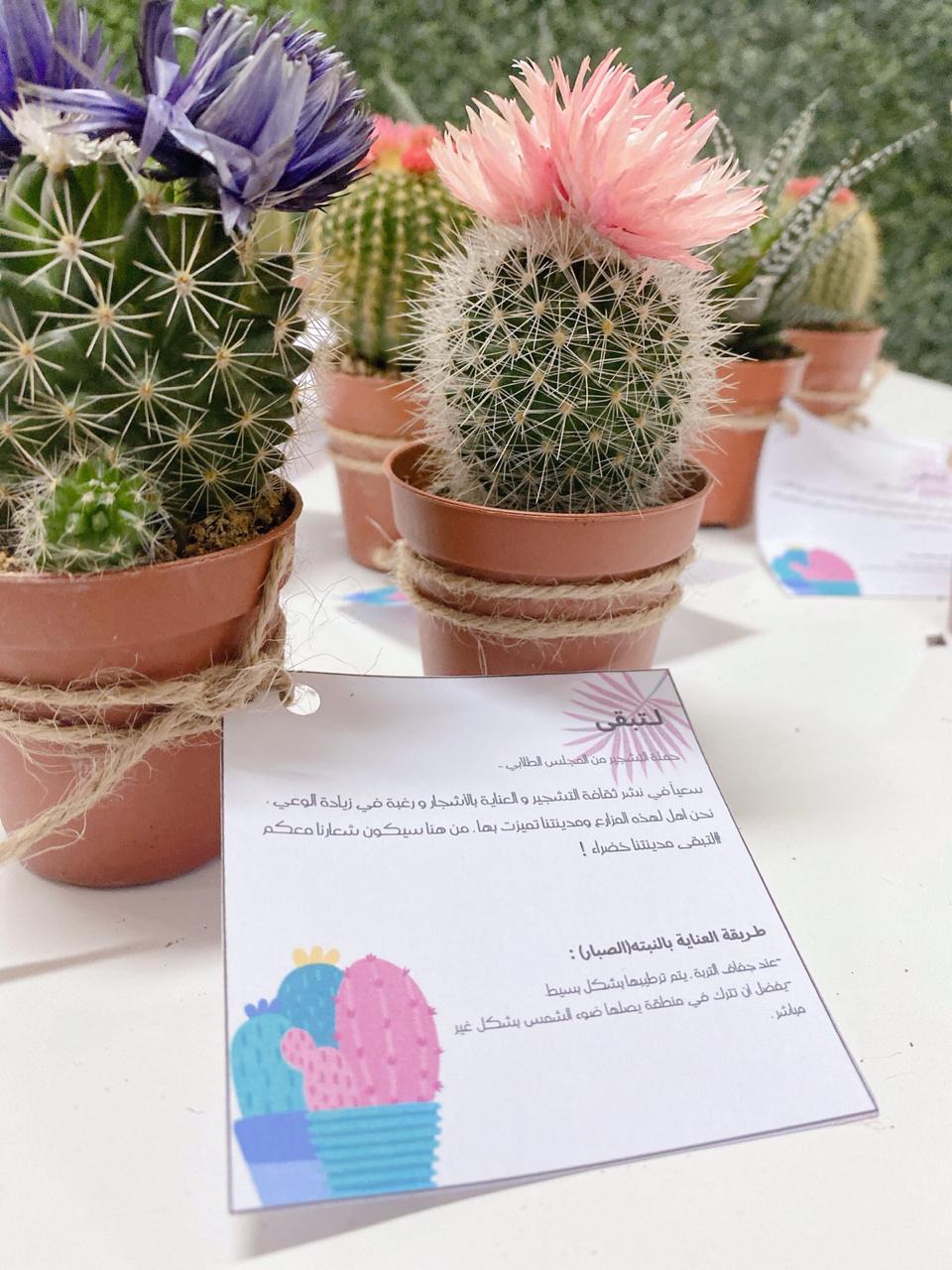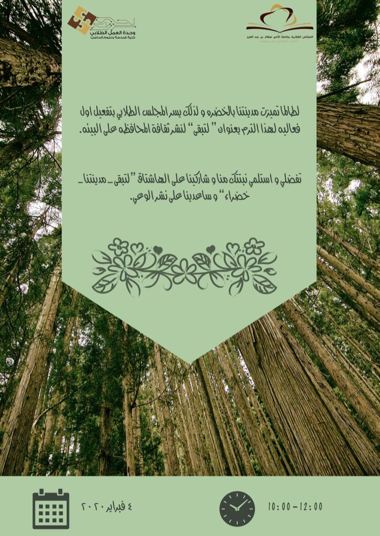 انطلقت كلية هندسة و علوم الحاسب بالخرج يوم الثلاثاء الموافق ١٤٤١/٦/١٠ أولى فعاليات المجلس الطلابي لشطر الطالبات للفصل الدراسي الجامعي الثاني تحت شعار "لتبقى مدينتنا خضراء" والتي تهدف إلى زيادة الوعي ونشر ثقافة التشجير والعناية بالنباتات؛ حيث تم عمل ركن يضم مجموعة من أنواع نباتات الصبار وكيفية العناية بها، وتم إطلاق الهاشتاق المُفعّل على تويتر #لتبقى مدينتنا خضراء ،لاستقبال تفاعل الطالبات ومساهمتهن بالعناية بالنباتات لتبقى مدينتنا دائمًا خضراء وذلك بإشراف مشرفة المجلس الطلابي أ.نوف بالعبيد .