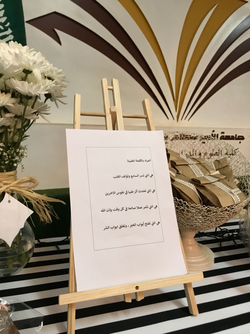 تحت رعاية عميدة كلية العلوم والدراسات الإنسانية بحوطة بني تميم د. حصة سعود الهزاني أقام قسم التربية وعلم النفس فعالية بعنوان ( الكلمة الطيبة) تحت شعار قوله تعالى : ( إليه يصعد الكلم الطيب ) يوم الأربعاء 18 / 7 / 1439 هـ بإشراف كلاً من :د رقية أحمد الحبو. و أ . إسلام العمري. تهدف الفعالية إلى التعريف بالكلمة الطيبة وهي الألفاظ الحسنة التي تخرج من فم الإنسان ابتداء أو جواباً، وتحمل معها الخير والنفع للناس، وتبتعد عن الفحش والبذاء، والإضرار والإيذاء، والشتم والاستهزاء. بدأت الفعالية بآيات من الذكر الحكيم. ثم تلتها فقرات الفعالية والتي تضمنت كلمة بعنوان الكلمة الطيبة وأثرها على النفس ثم تلتها كلمة عن فوائد الكلمة الطيبة وتخلل العرض مقاطع فديو جميلة تتحدث عن الكلمة الطيبة وإن الكلمة الطيبة نبتة حسنة تثمر وتزهر في نفوس الخلق وترسل لهم ألذ الثمر وأطيب العرف الشذي. صاحب الفعالية أركان من إبداع الطالبات حوت منشورات وتوزيعات تحمل عبارات تعريفية وتوجيهية ووصفية للكلمة الطيبة وأثرها العظيم في النفوس. حضر الفعالية عدد من أعضاء هيئة التدريس وعدد من الطالبات ونالت الفعالية استحسان الجميع.