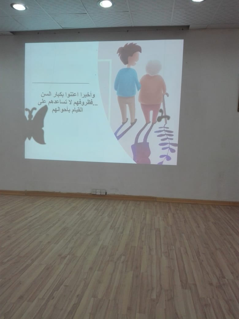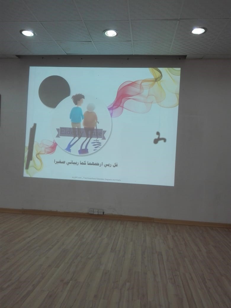 تزامنا مع اليوم العالمي للمسنين نظمت محاضرة بعنوان وقل رب ارحمهما كما ربياني صغيرا في كلية العلوم الطبية التطبيقية وذلك للحديث عن فضل رعاية الكبير وكيفية العناية به وما أهم الأمراض الشائعة لهذا السن والتوعية بطرق التغذية السليمة ، كما تم إعداد ركن مصاحب يحتوي علي منشورات ونصائح مفيدة للعناية بالكبير وقدم عرض مرئي يوضح الأمراض الشائعة التي تصيب كبار السن ،وتم توزيع أكياس تحتوي على سجادة صلاة تهدى لأحد كبير بالسن ،واختتمت المحاضرة بالحث على البر بالكبير فهو جنة الدنيا ، كما أوصى بذلك ديننا الحنيف وتحقيقًا لقول الله في كتابه الكريم " وقل رب ارحمهما كما ربياني صغيرا"