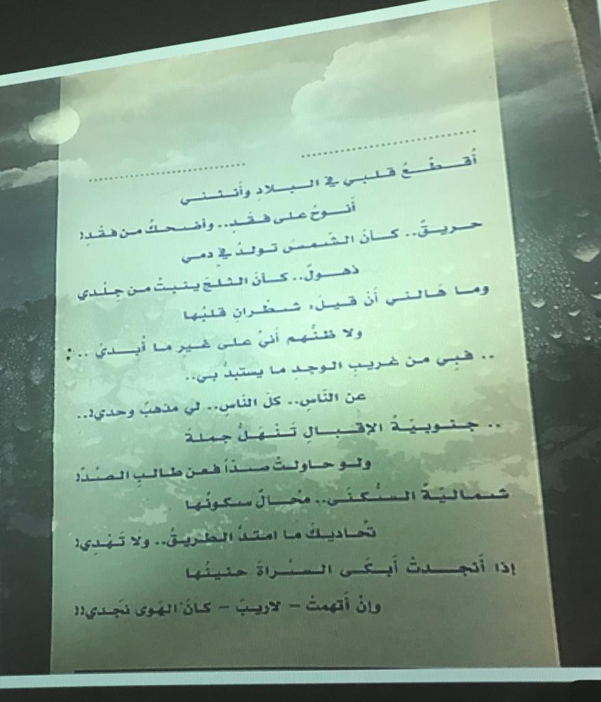 عقد النادي الأدبي المسرحي في كلية التربية بالخرج اليوم الثلاثاء الموافق ٢٣/٢/١٤٤١هـ,فعالية (قراءة في قصيدة ).عقدت هذه الفعالية الدكتورة /نداء الحقباني مع طالبات قسم اللغة العربية .وكان من أهم أهدافها تنمية مهارة قراءة النصوص الشعرية أمام الجمهور,والقدرة على النقد الموضوعي ومعرفة العلاقة بين المبدع والنص والمتلقي ,وتنمية ملكة التذوق الأدبي لفهم النص .وقد لاقت تفاعلاً و حماساً من طالبات القسم.
