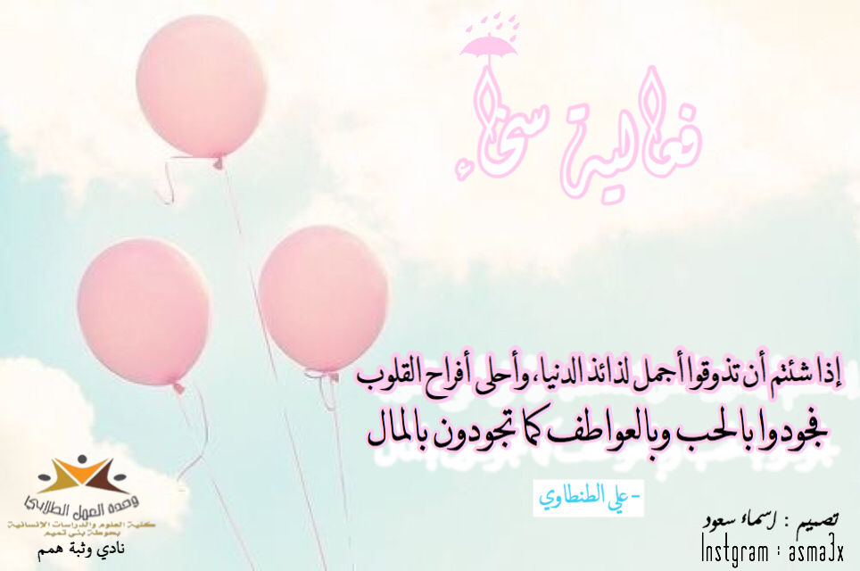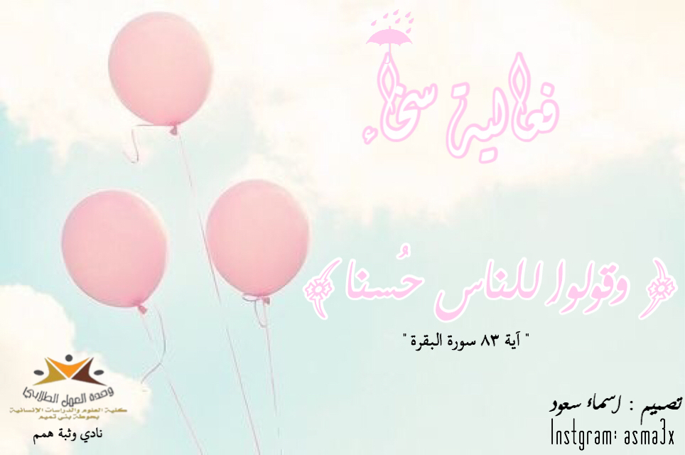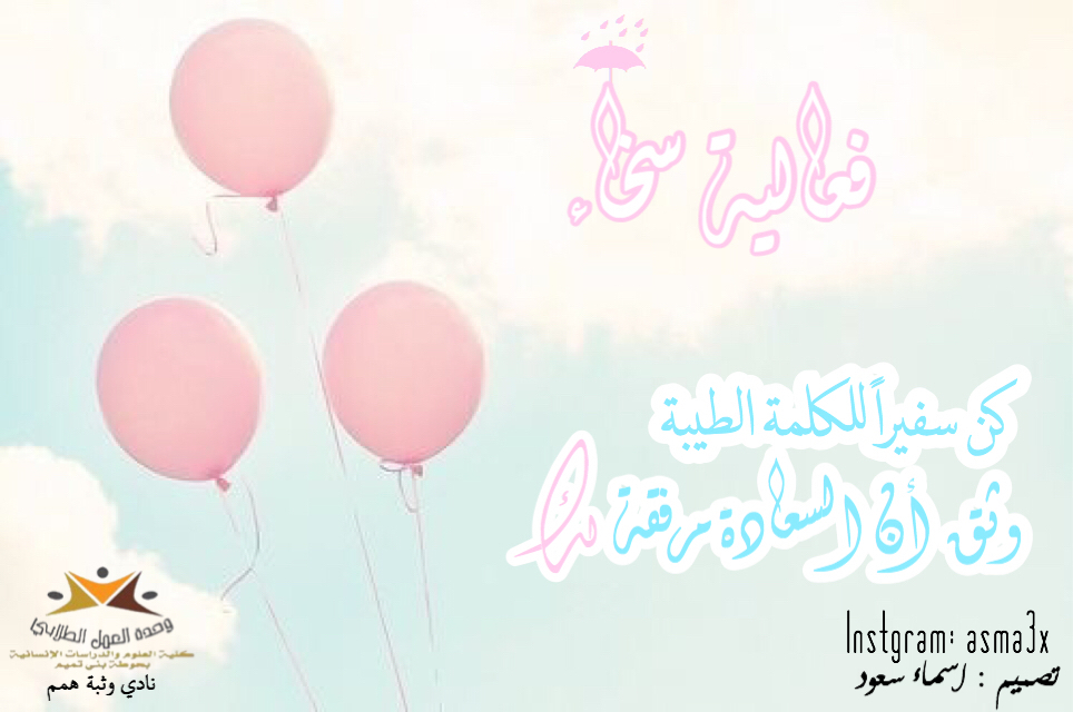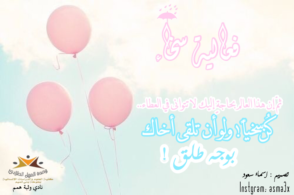 انطلقت يوم الثلاثاء الموافق 22\2\1438هـ عند الساعة 12 ظهراً بساحة كلية العلوم والدراسات الإنسانية بحوطة بني تميم فعالية سخاء والتي ينظمها نادي وثبة همم. والتي تهدف إلى نشر ثقافة السخاء والجود بالكلمة الطيبة لما للقول الحسن من تأثير كبير وإيجابي في نفوس البشر، ونشر السعادة من خلال القول الطيّب الحسن. ويستمر نشر السخاء في هذه الفعالية لمدة ثلاثة أيام في الكلية وعبر وسائل التواصل الاجتماعية.