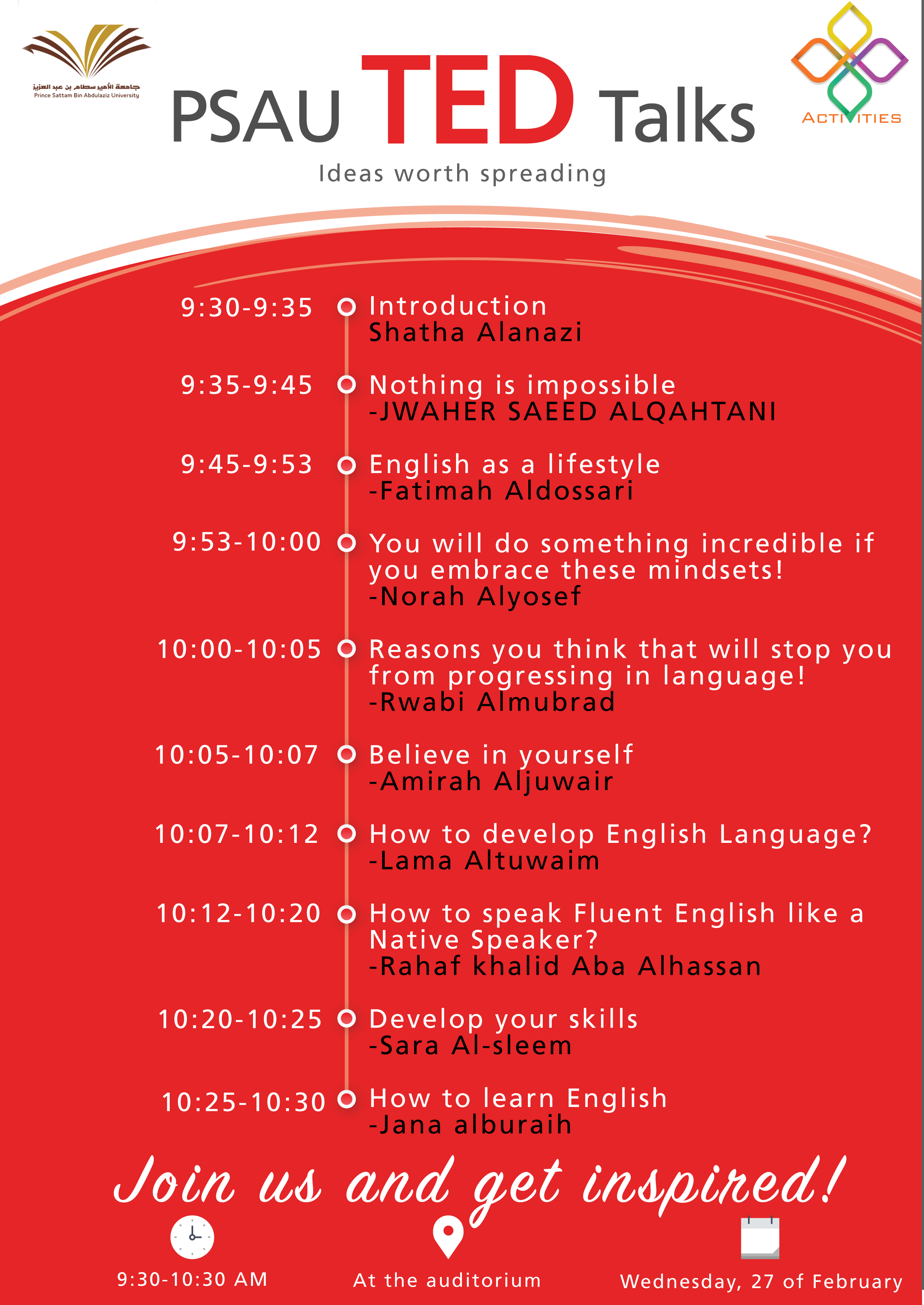 حيث استمع الحضور لمجموعة من الطالبات المتحدثات، قدموا حديثهن بطريقة فريدة على خشبة المسرح ,فكل متحدثة من الطالبات قدمت حديثًا مهمًا على أمل أن تلهم أحد الحضورففي حديثهن شاركن الطالبات أفكارهن القيمة وتجاربهن الفريدة في رحلة تعلمهم للغة الانجليزية.