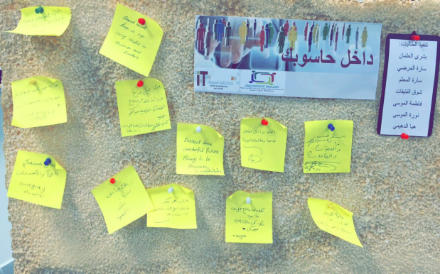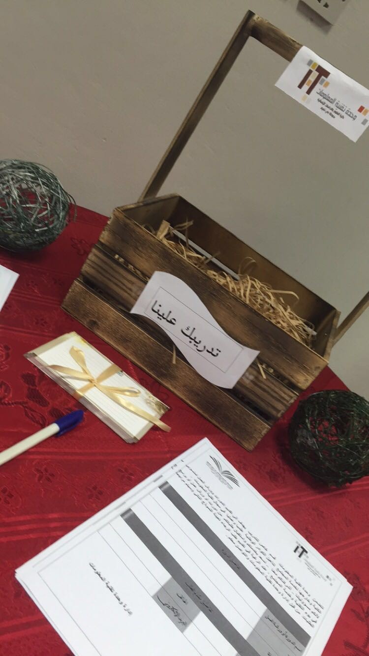 10- وأخيرا ركن " تدريبك علينا " حيث يهدف إلى أن يقدم لمنسوبات الكلية أو خارجها بطلب ما يرغبن فيه من تطوير مهاراتهن ومعرفة احتياج كل فرد منهم لتحقيقه والهدف من ذلك السعي إلى تأهيل المجتمع المحلي في مجال تقنية المعلومات وقد قامت الطالبتان هيا القريني والطالبة نورة الدبل باستقبال الطلبات مع أعضاء وحدة تقنية المعلومات .