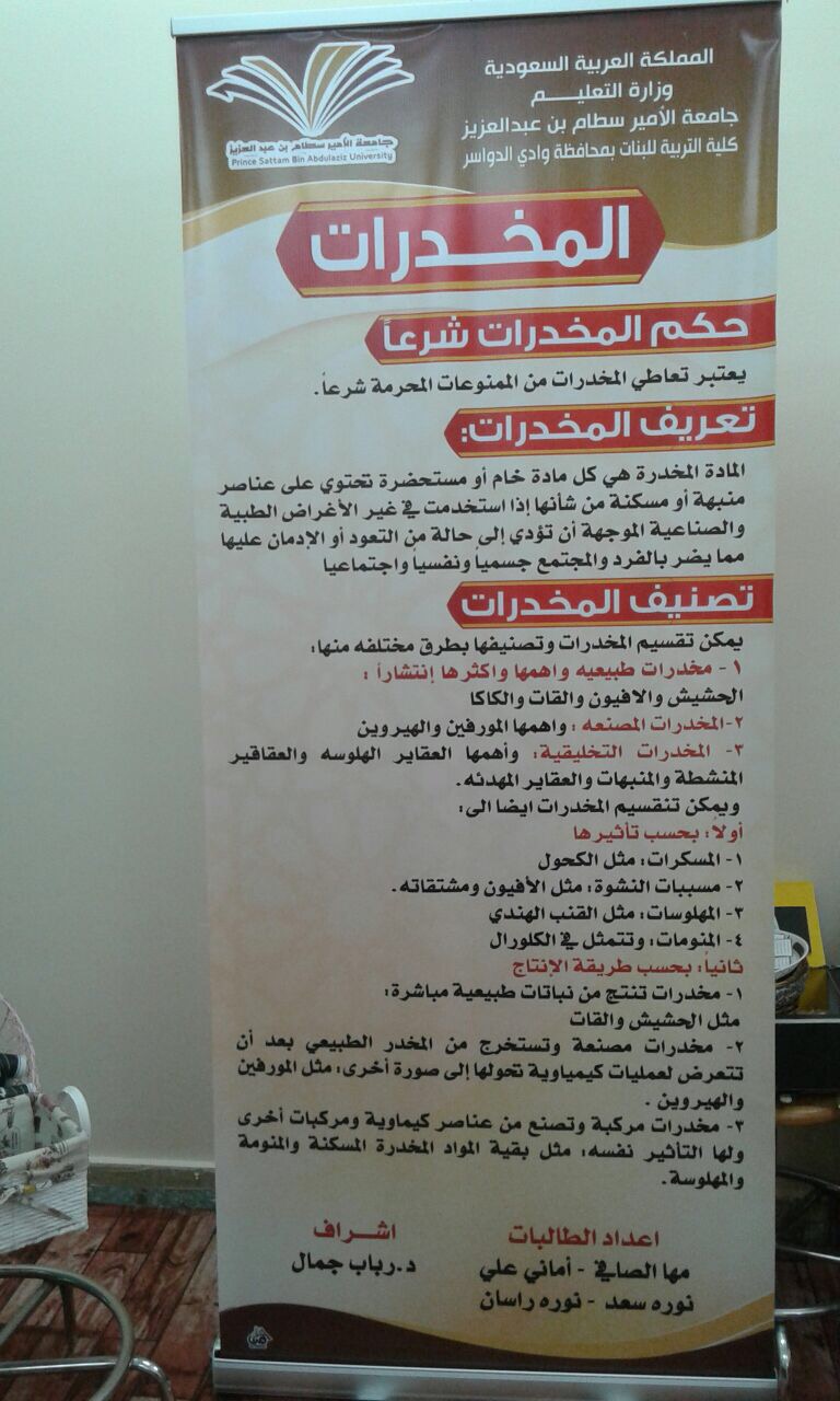 نظمت لجنة الأنشطة الطلابية بكلية التربية بوادي الدواسر فعالية بعنوان (ظاهرة المخدرات وأضرارها وسبل الوقاية منها) تحت إشراف مشرفة العمل الطلابي أ. رباب جمال عبدالحميد وكذا طالبات المستوى السادس والسابع بقسم التربية الخاصة وذلك في مسرح الكلية ، وقد تضمنت الفعالية تعريف الطالبات بأنواع المخدرات الطبيعية والصناعية ، وتوعيتهن بأضرارها الصحية والجسدية والنفسية والاقتصادية والاجتماعية ، وتم توضيح الطرق لمواجهة الرغبة في العودة للإدمان، وتم تقديم النصائح للوقاية من الانحراف ، وبيان كيفية اكتشاف المدمن.