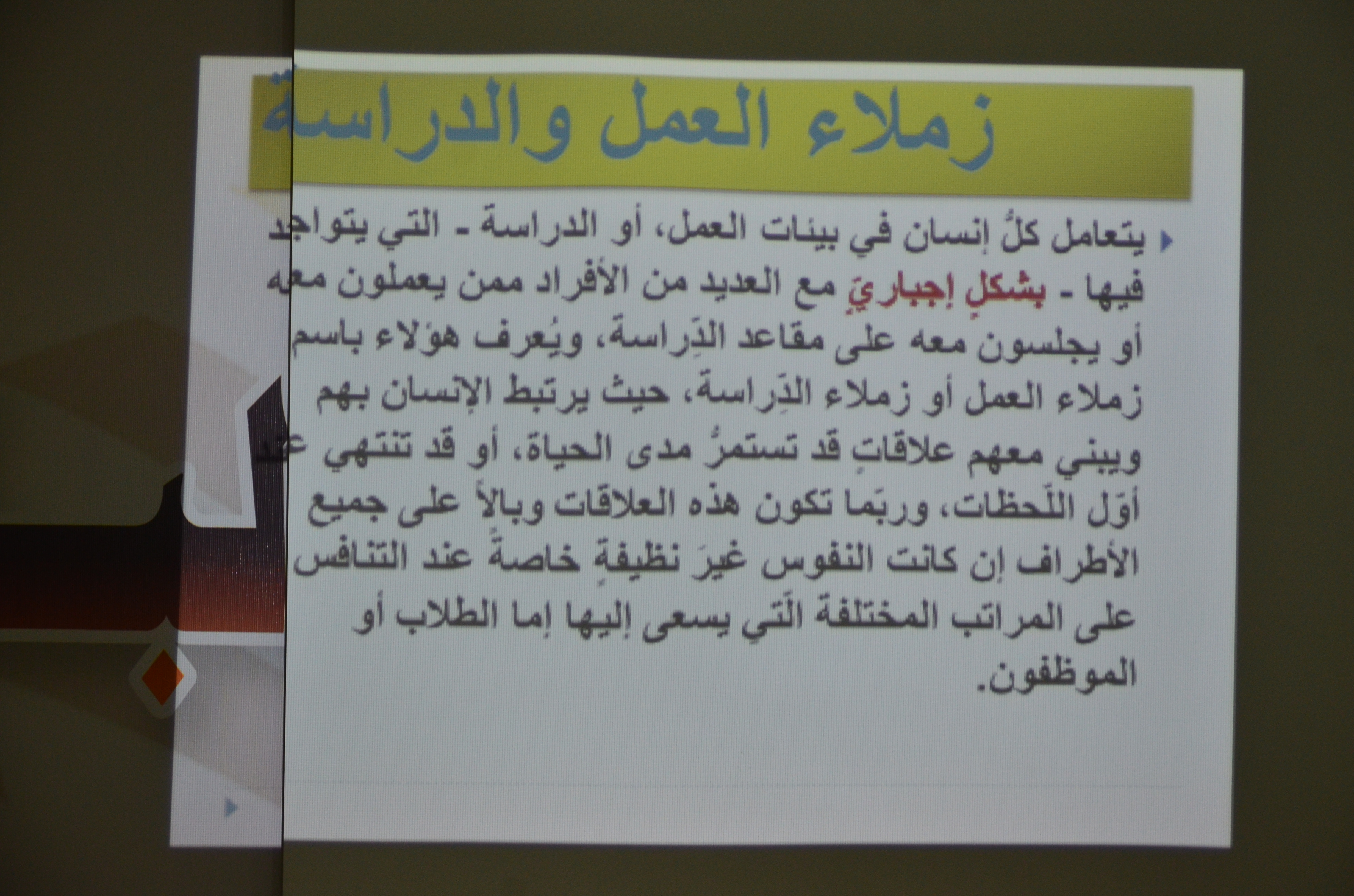 نظمت وحدة الخريجات بكلية العلوم والدراسات الإنسانية بالأفلاج (شطر الطالبات) يوم الثلاثاء ١٤٤٠/٢/٢٨ هـ في مسرح الكلية الساعة الثانية عشر ظهراً دورة تدريبية بعنوان ( فن التعامل في العمل مع الآخرين ) قدمتها عضو هيئة التدريس الأستاذة فكرات المثقال ، افتتحتها بتنمية المهارات القيادية من خلال النجاح ، كما وضحت صفات الشخصية القيادية ، بعدها انتقلت لكيفية التعامل مع زملاء العمل والطرق التي يحتاج إليها الموظف في مجال عمله كالمرونة والصراحة و الإيجابية و احترام الأخرين وكذلك ايضاً اتيكيت التعامل مع الزملاء ، كما ذكرت أفضل أساليب التعامل مع الذين يصعب التعامل معهم في مجال العمل .