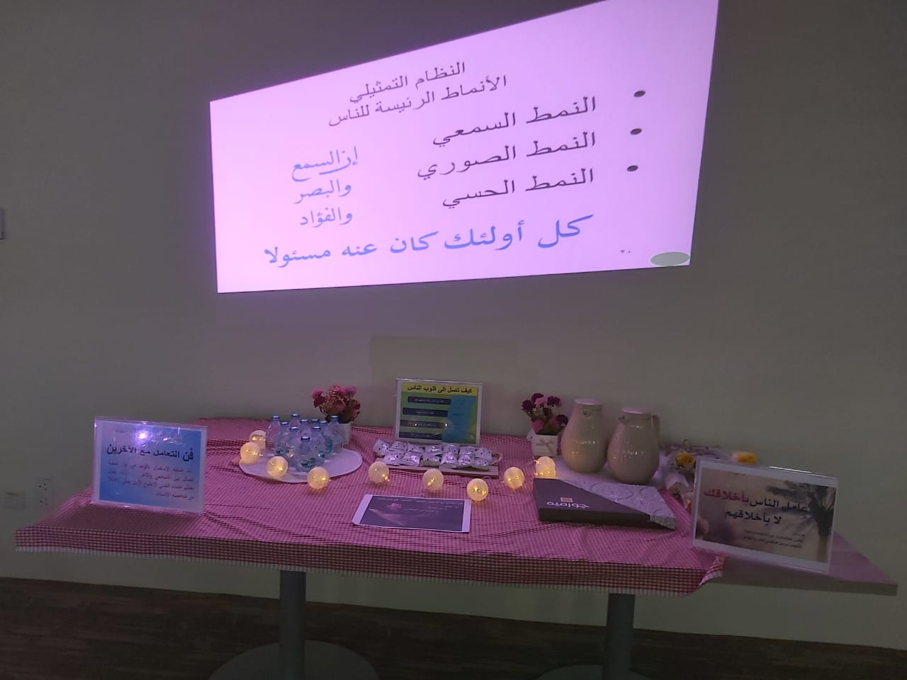 نظمت وحدة العمل الطلابى ممثلة فى الأندية الطلابية ( النادى الدينى) بكلية العلوم الطبية التطبيقية بوادي الدواسر يوم الأربعاء الموافق ١٤٤١/٣/٩ ورشة عمل تدربية بعنوان (فن التعامل مع الآخرين) قدمتها أ : بخيتة محمد مبارك بهدف إكساب منسوبات الكلية مهارات التعامل مع الآخرين في مجال التواصل تناولت الورشة عدة محاور من أهمها: قصة البداية مفهوم السلوك الإنساني وصفاته السر في تعلم هذا الفن وتم تسليط الضوء على أنماط الشخصية التمثيلي وعرض المفاتيح والارضيات لفن التعامل تخلل الورشة عدد من التدريبات لفن التعامل وفي الختام تم توزيع ورد على الحضور بعنوان (شكرًا من القلب )