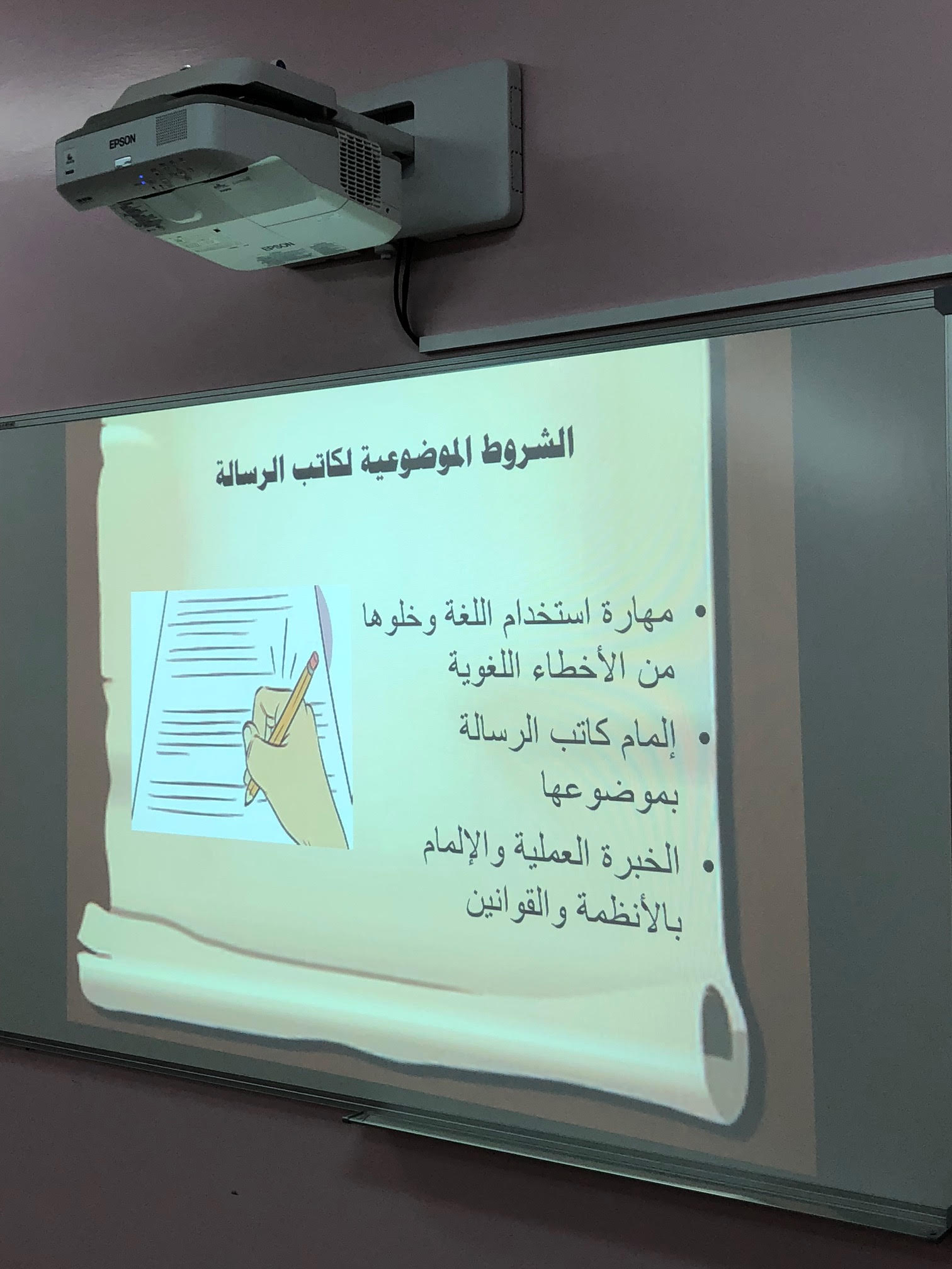 على شرف سعادة وكيلة كلية المجتمع بالخرج الدكتورة/ أمينة بنت عبدالرحمن المشحن، أقامت وحدة العمل الطلابي بالكلية قسم الأنشطة الاجتماعية والثقافية دورة تدريبية بعنوان (فن كتابة المراسلات الإدارية) من تقديم الأستاذة/ نورة بنت خالد العتيبي ، وذلك يوم الثلاثاء الموافق17- 6- ١٤٤١هـ في قاعة الأنشطة الطلابية بالكلية.