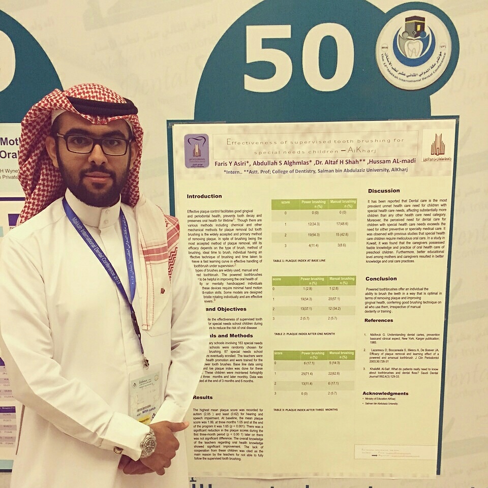 قدم عن هيئة ملصق علمي في مؤتمر الاتحاد الآسيوي السابع والثلاثون لطب الأسنان الذي أقيم في مدينة "سينتك" في سنغافورة بتاريخ 3إلى5إبريل 2015م