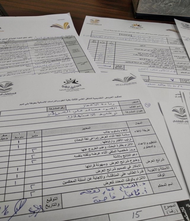 عقدت لجنة الملتقى العلمي الثالث بكلية العلوم والدراسات الانسانية بحوطة بني تميم اجتماع لفرز نتائج التحكيم الداخلي لمشاركات الطالبات يوم الأحد الموافق 5/ 6/ 1440 هـ الساعة العاشرة صباحاً بمسرح الكلية. حيث قامت اللجنة بتقييم المشاركات النهائية واستلام نتائج لجنة التحكيم وفرزها وإصدار المراكز على مستوى الكلية. تم تقديم (9) مشاركات مقسمة على المحاور وتم استبعاد مشاركة واحدة لعدم توفير معايير التقييم فيها. جاءت نتائج واحصائيات المشاركات في محاور الملتقى كالتالي: