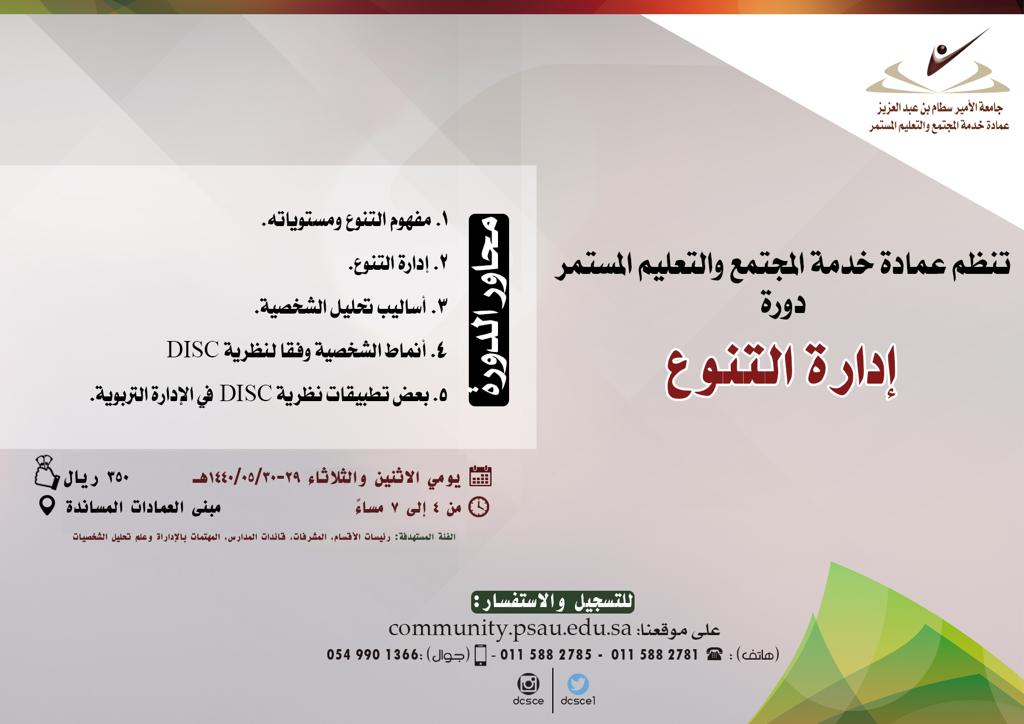 تعلن عمادة خدمة المجتمع والتعليم المستمر بجامعة الأمير سطام بن عبدالعزيز بالخرج (الشطر النسائي) عن فتح التسجيل في البرنامج التدريبي " إدارة التنوع " تقدمها الدكتورة : سارة بنت مسفر الحقباني (مديرة برنامج تطوير مهارات التربويات بإدارة التعليم بالخرج ) ينطلق البرنامج التدريبي يوم الاثنين29/5/1440هـ الموافق 4/2/2019 ولمدة يومين من الساعة 4 مساءاً إلى الساعة 7 مساءاً في مقر عمادة خدمة المجتمع والتعليم المستمر في مبنى العمادات المساندة .