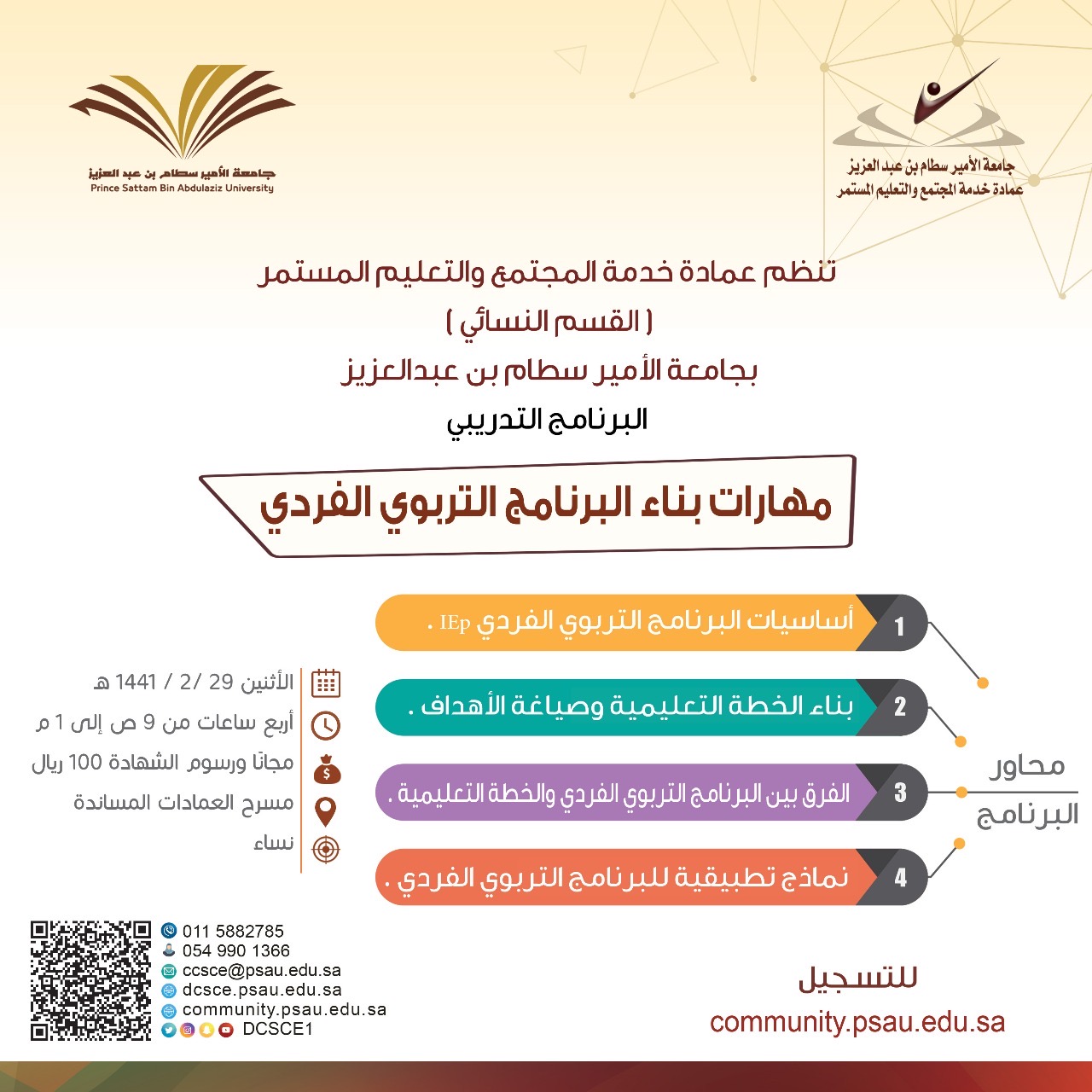 تعلن عمادة خدمة المجتمع والتعليم المستمر (القسم النسائي) بجامعة الأمير سطام بن عبدالعزيز عن فتح التسجيل في البرنامج التدريبي "مهارات بناء البرنامج التربوي الفردي "حيث ينطلق البرنامج التدريبي يوم الأثنين (29/02/1441 هـ الموافق 28/10/2019 م ) من الساعة background-origin: padding-box;background-position-x: 0%;background-position-y: 0%;