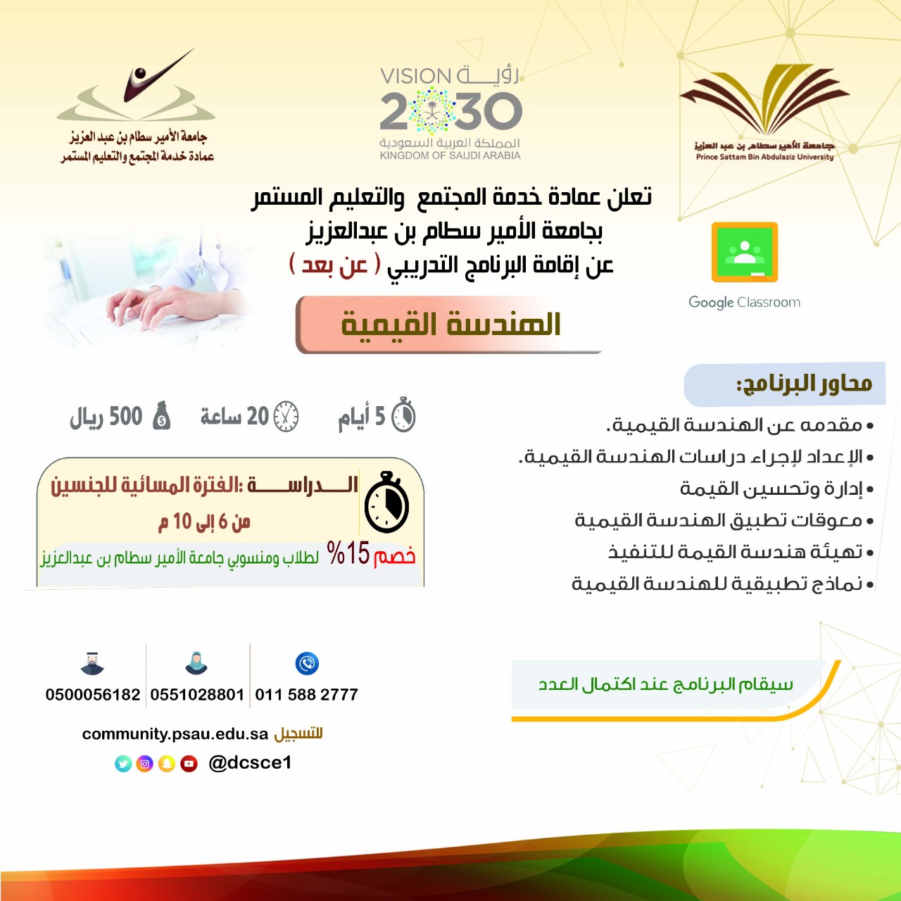 تعلن عمادة خدمة المجتمع والتعليم المستمر عن فتح التسجيل في عدد من البرامج التدريبية المتخصصة