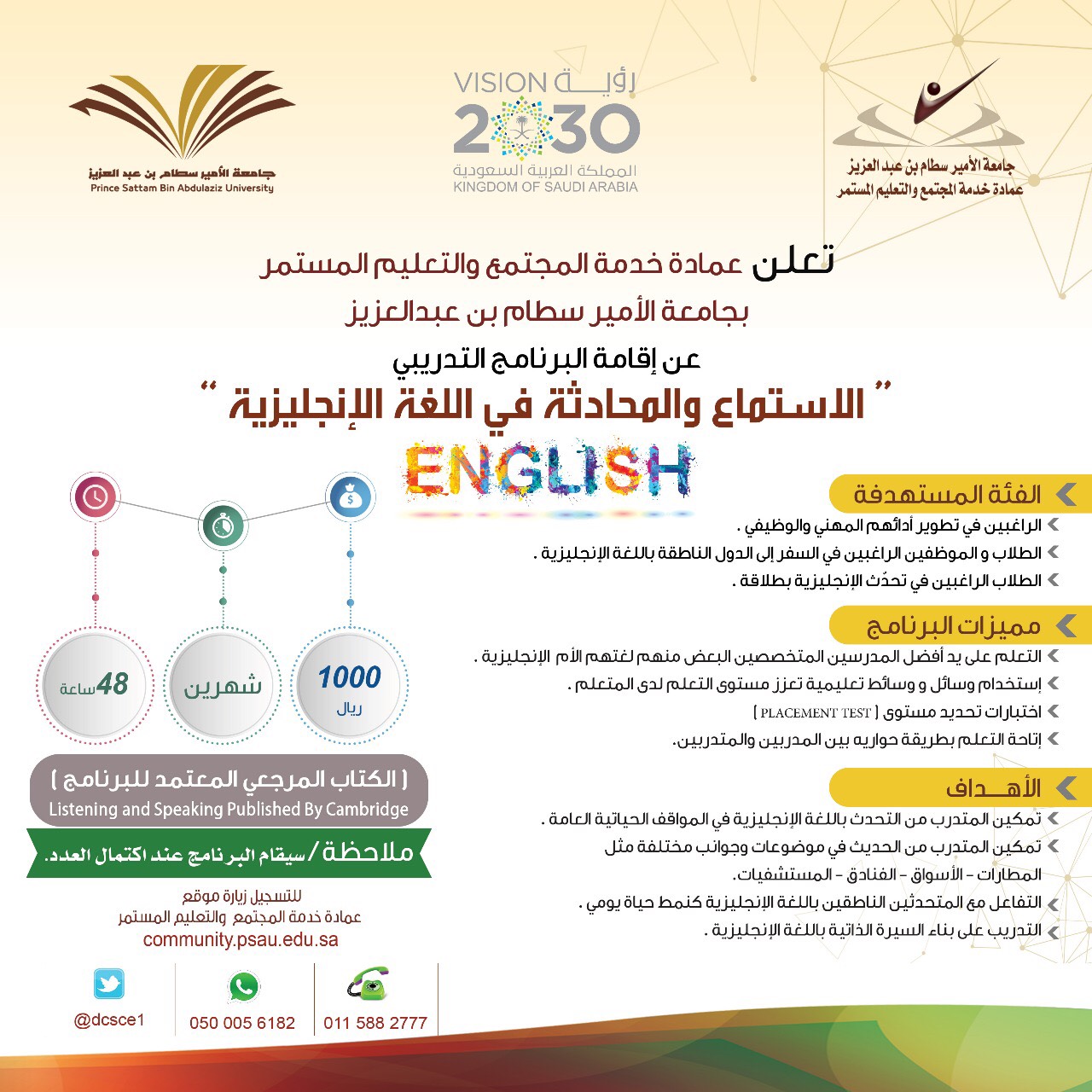 تعلن عمادة خدمة المجتمع والتعليم المستمر بجامعة الأمير سطام بن عبدالعزيز عن فتح باب التسجيل في برنامج : الاستماع والمحادثة باللغة الإنجليزية وذلك من خلال زيارة مركز التدريب الجامعي المعتمد لطرح البرامج التدريبية والتعليمية بالجامعة .