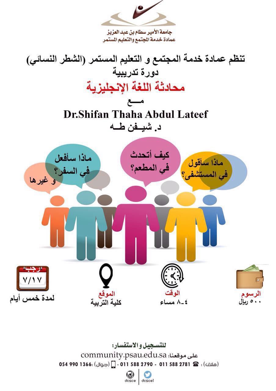 تعلن عمادة خدمة المجتمع والتعليم المستمر بجامعة الأمير سطام بن عبدالعزيز بالخرج (الشطر النسائي) عن فتح التسجيل لبرنامج < محادثة اللغة الإنجليزية > مع Dr. Shifan Thaha Abdul Lateef