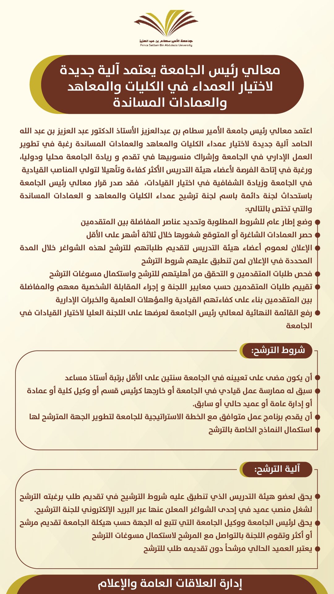 بناءً على توجيه معالي رئيس الجامعة، تعلن لجنة ترشيح عمداء الكليات و المعاهد و العمادات المساندة عن استقبال طلبات الترشيح للمناصب التالية: