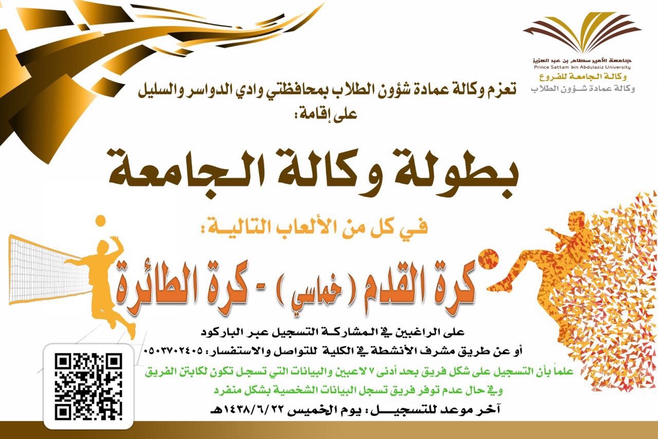 تعتزم وكالة عمادة شؤون الطلاب بمحافظتي وادي الدواسر والسليل إقامة بطولة وكالة الجامعة للفروع في لعبتي كرة القدم ( الخماسي) ولعبة كرة الطائرة فعلى الراغبين بالمشاركة التسجيل عبر الباركود الموجود بالاعلان او عن طريق مشرف الانشطة بالكلية ، علما بأن التسجيل علي شكل فريق يكون بحد أدنى ٧ لاعبين والبيانات تسجل باسم كابتن الفريق وفي حالة عدم وجود يسجل الطالب بشكل منفرد .