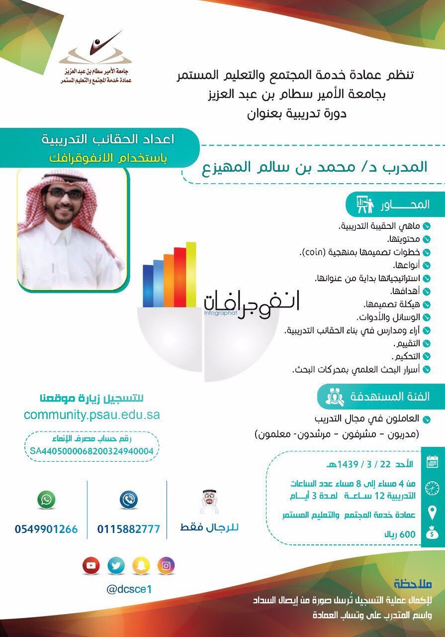 تعلن عمادة خدمة المجتمع و التعليم المستمر بجامعة الأمير سطام بن عبدالعزيز عن فتح باب التسجيل في البرنامج التدريبي ( إعداد الحقائب التدريبية باستخدام الآنفوجرافيك ) للرجال .