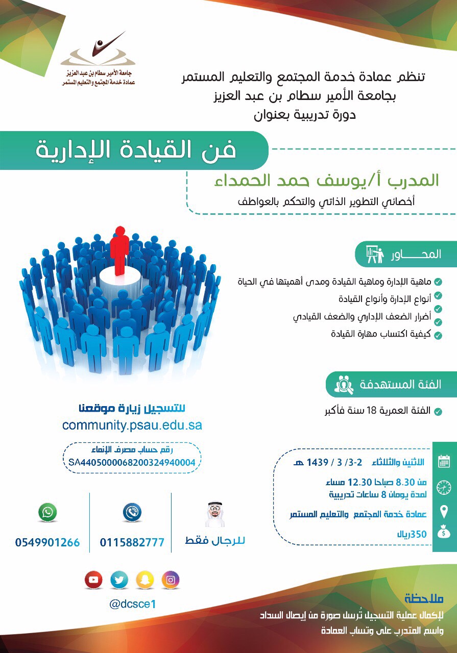 تعلن عمادة خدمة المجتمع و التعليم المستمر بجامعة الأمير سطام بن عبدالعزيز عن فتح باب التسجيل في البرنامج التدريبي ( فن القيادة الإدارية ) للرجال .