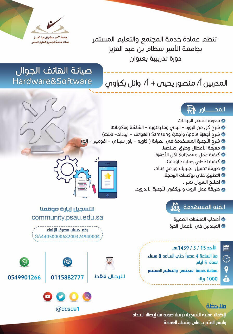 أعلنت عمادة خدمة المجتمع والتعليم المستمر بجامعة الأمير سطام بن عبدالعزيز عن فتح باب التسجيل في البرنامج التدريبي ( صيانة الهاتف الجوال - hatdware & soft ware ) للرجال، والتي تنطلق يوم الأحد الموافق15/3/1439 هـ ولمدة 5 أيام من الساعة 4 مساء إلى الساعة 8 مساء، ويقدمها المهندس الأستاذ / منصور بن يحيى . و المهندس الأستاذ / وائل بكراوي .