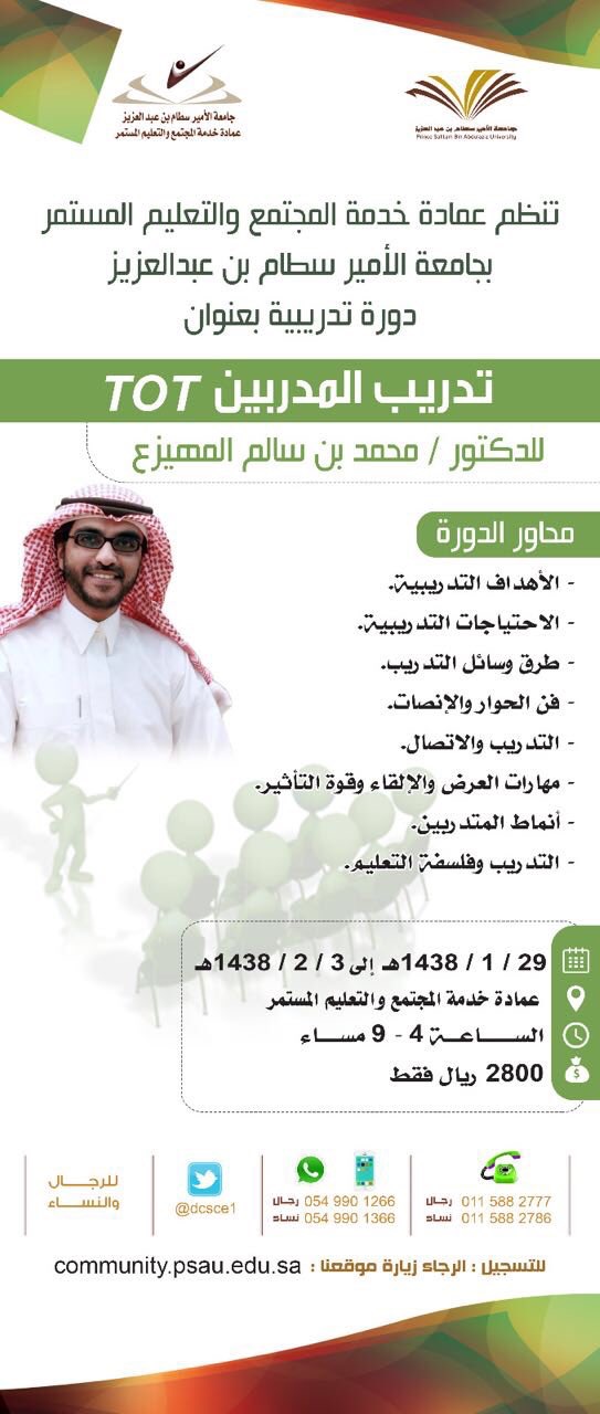 أعلنت عمادة خدمة المجتمع و التعليم المستمر بجامعة الأمير سطام بن عبدالعزيز عن فتح باب التسجيل في البرنامج التدريبي ( تدريب المدربين ) , والتي يقدمها المدرب الدكتور / محمد بن سالم المهيزع , وعميد كلية طب الأسنان بالجامعة , حيث تنطلق الدورة يوم الأحد الموافق 29/1/1438 هـ إلى مساء يوم الخميس 3/2/1438 هـ , من الساعة 4 عصراً إلى 9 مساءاً , للرجال و النساء .
