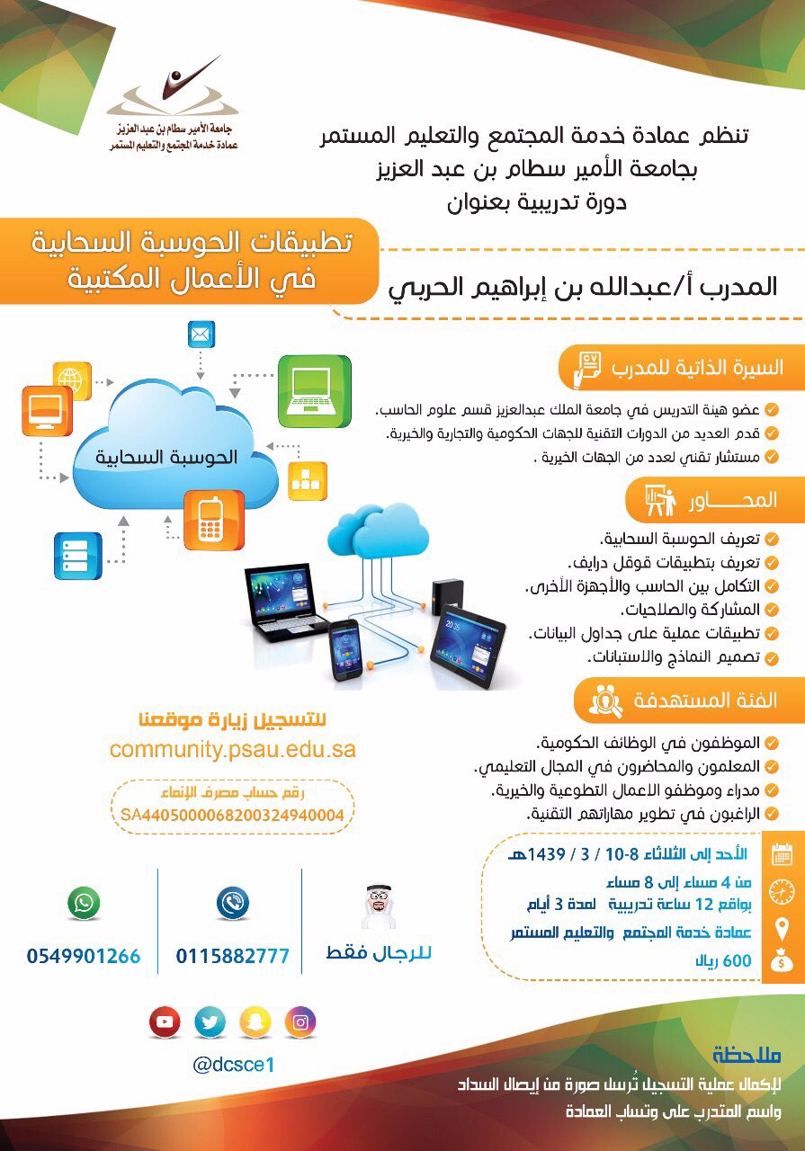 تعلن عمادة خدمة المجتمع والتعليم المستمر بجامعة الأمير سطام بن عبدالعزيز عن فتح باب التسجيل في البرنامج التدريبي ( تطبيقات الحوسبة السحابية في الأعمال المكتبية) للرجال، وتنطلق الدورة يوم الأحد الموافق 8/3/1439 هـ ولمدة 3 أيام من الساعة 4 عصرًا إلى الساعة 8 مساءً، يقدمها المستشار التقني الأستاذ / عبدالله بن إبراهيم الحربي .