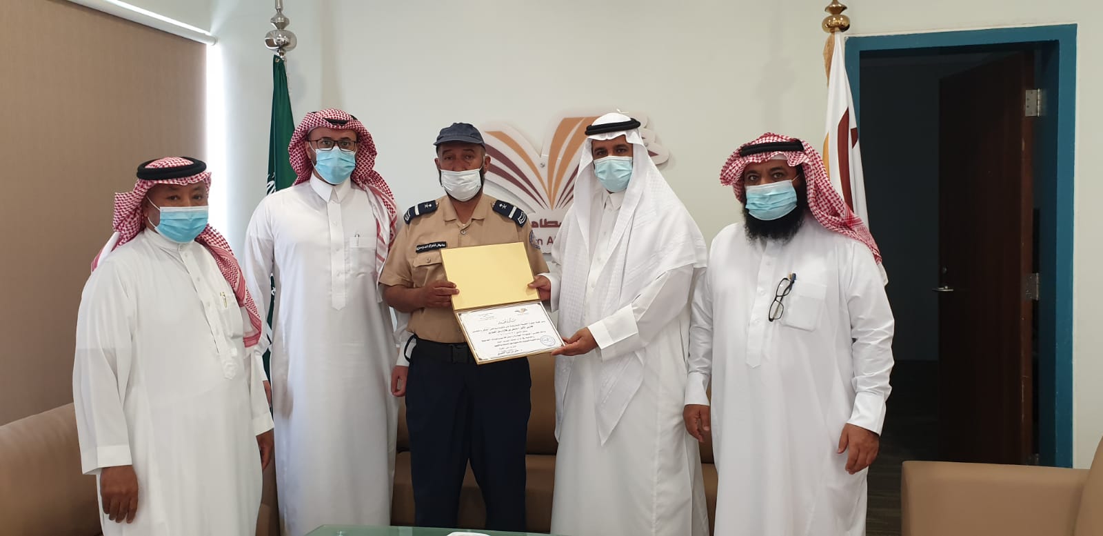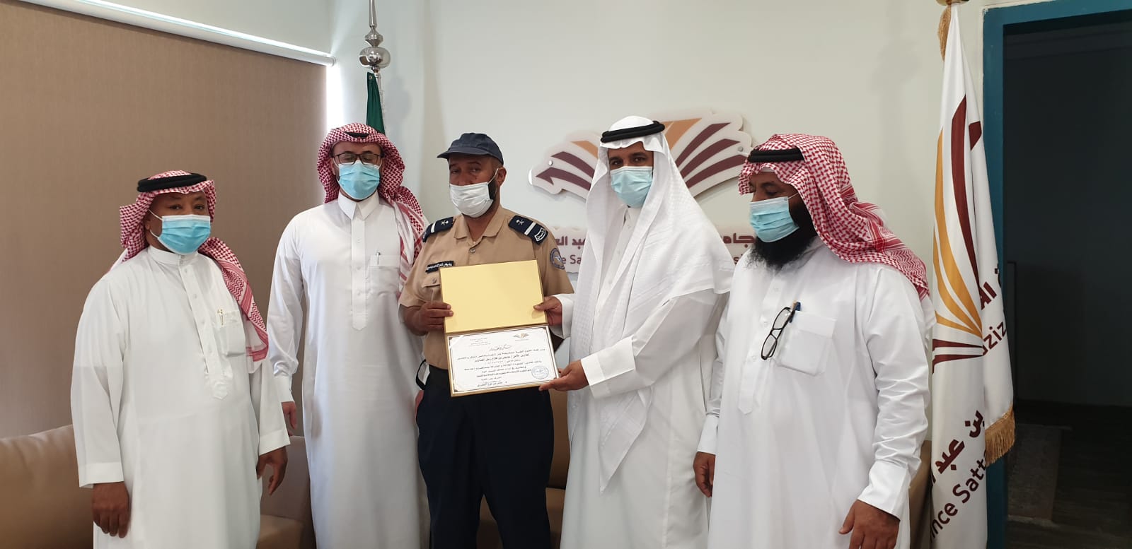 كرّم عميد كلية الآداب والعلوم بمحافظة وادي الدواسر ، د. عمر بن نوح المطيري اليوم في مكتبه الموظف عايض بن فلاح المصارير , احد منسوبي الأمن والسلامة بالكلية وجاء تكريم حارس الامن "المصارير" والذي لقى اشادة واسعة من الجميع لحرصه الشديد في تطبيق الاحترازات الوقائية بالكلية اثناء عمله على الجميع .