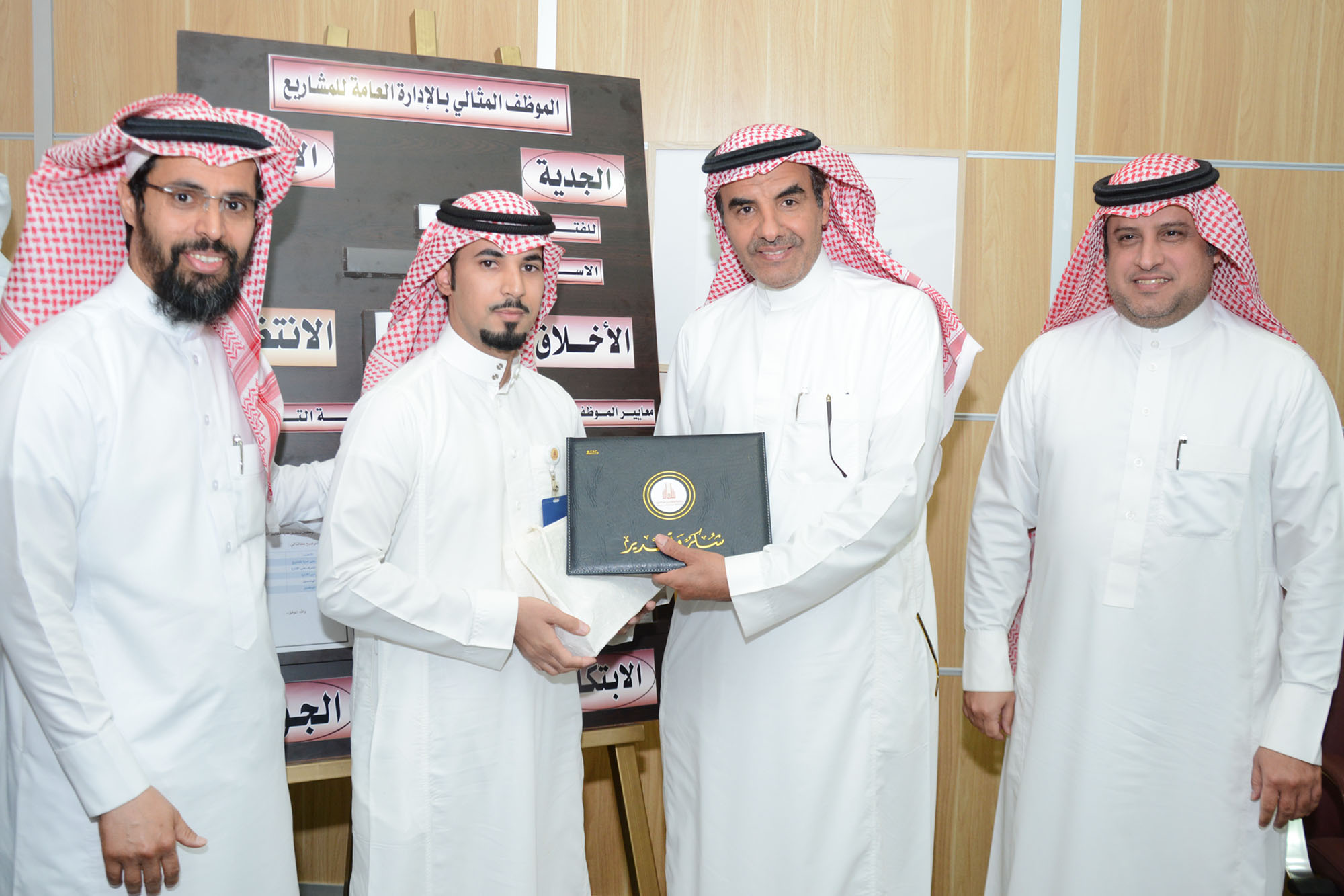 وفي كلمة للدكتور العاصمي أكد بعد شكره للجميع على جهودهم المبذولة على أهمية الإخلاص في العمل ، وأهمية نشر ثقافة الجودة بين جميع العاملين ، كما أكد على أهمية المتابعة المستمرة ، ومعالجة المشكلات أول بأول والتي قد تكون سبباً في إعاقة سير العمل ، وأضاف العاصمي أننا في الجامعة نسابق الزمن من أجل توفير البيئة الأكاديمية المثالية للطلاب والطالبات وبالتالي يجب استغلال الوقت والعمل بجدية ، وان هذه السنوات هي سنوات عمل وجهد وسنوات أنجاز وبناء وتأسيس ، وفي نهاية الاجتماع قام معالي مدير الجامعة بتكريم الموظف المثالي وهو المهندس محمد سالم المشنوي ، وفي الختام شكر الدكتور الجمعة معالي مدير الجامعة على حضوره وتشجيعه لأبنائه الموظفين مؤكداً أن هذه الزيارة بلا شك ستكون حافز للجميع لبذل المزيد من الجهد والعطاء ، وقد أوضح الجمعة أن هذه الجائزة مستمرة فمثل مانحن نحساب المقصر فنحن أيضاً نكافئ المتميز .