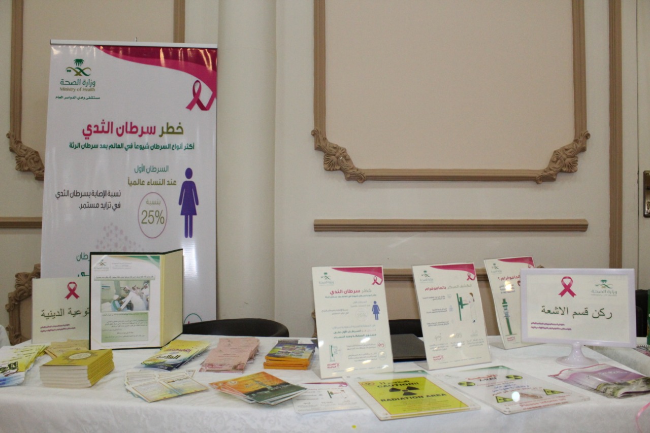 بحضور محافظ وادي الدواسر الأستاذ عبدالله سليمان المبارك وبالشراكة مع مستشفى وادي الدواسر العام شاركت كلية العلوم الطبية فى فعاليات معرض سلطانة بمناسبة شهر التوعية لسرطان الثدي بمركز دانة للفتاة والمرأة بالخماسين يومى الثلاثاء والأربعاء بتاريخ ٢٩/١- ١/٢/١٤٤٠ وقامت طالبات الإمتياز بالكلية بقسمى المختبرات الطبية وعلوم التمريض وتحت إشراف وحدة التدريب بالكلية بعمل منشورات عن كيفية الإكتشاف المبكر للمرض وأسبابه وكيفية الوقاية من سرطان الثدي حيث أنه أكثر الأمراض انتشارا بين النساء وإعداد ركن تثقيفي خاص داخل المعرض وذلك لنشر الوعي وسط المجتمع وترسيخ ثقافة الكشف المبكر وصرح المشرف على الكلية د ماجد علي الشريدة بحرص الكلية على الشراكة المجتمعية وخدمة المجتع وتتثقيفه صحيا والحرص على مثل هذه المناسبات بنشر الوعي الصحي بين أفراد المجتمع