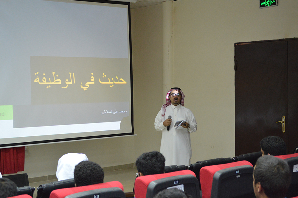 تناول فيها مجالات العمل المختلفة في القطاعين الحكومي والخاص، مشيرًا إلى ما يلائم التخصصات العلمية لطلاب الكلية. كما بيّن عناصر السيرة الذاتية التي ينبغي للمتقدم إلى العمل الإشارة إليها وتوضيحها لجهة العمل، مؤكدًا أهمية الظهور بالمظهر اللائق في المقابلة الشخصية لطالب الوظيفة، والاستعداد الذهني والنفسي لها؛ لتأثير هذه العوامل في شأن القبول بالوظيفة أو عدمه.
