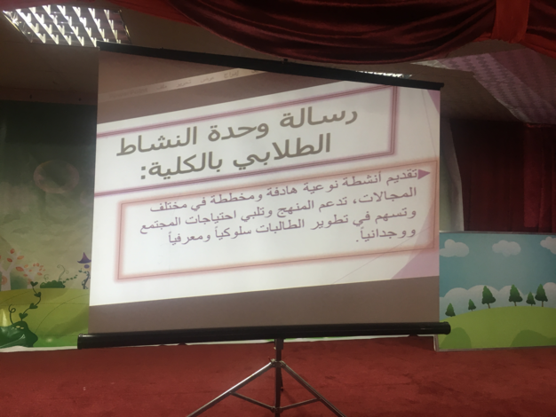 نظمت وحدة النشاط اللامنهجي بكلية التربية بوادي الدواسر يوم الأثنين الموافق 15/5/1440هـ حفلاً توعويا لأستقبال الطالبات المستجدات للعام الجامعي 1440-1441 هـ بقسم رياض الأطفال وذالك بإشراف وكيلة الكلية للشؤون التعليمية الدكتورة / منال عبدالعليم ومشرفة النشاط اللامنهجي الدكتورة / رباب جمال . وقد استهدف الحفل دعم الطالبة علمياً لفهم وإستيعاب رؤية وأهداف ورسالة الكلية وتهيئتها للإندماج بالمجتمع الجامعي . ثم استعرضت مشرفة النشاط في بيان تعريفي أنظمة الكليه وأقسامها ومرافقها العامة وأبجديات التعامل مع البوابة الإلكترونية وكذلك التعريف بوحدات الكلية ( النشاط الطلابي ، الإرشاد الأكاديمي ، القبول والتسجيل ، الأمن والسلامة ... الخ ) واختتم الحفل بعد الإجابة على استفسارات الطالبات بالدعاء لهن بالتوفيق والتقدم .