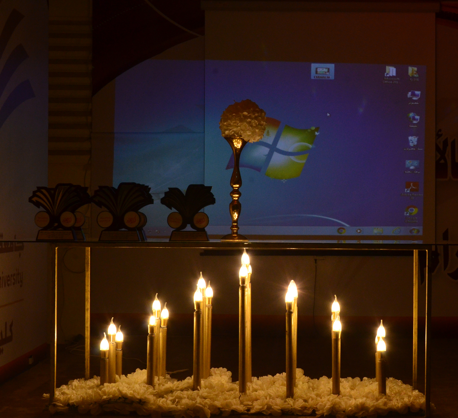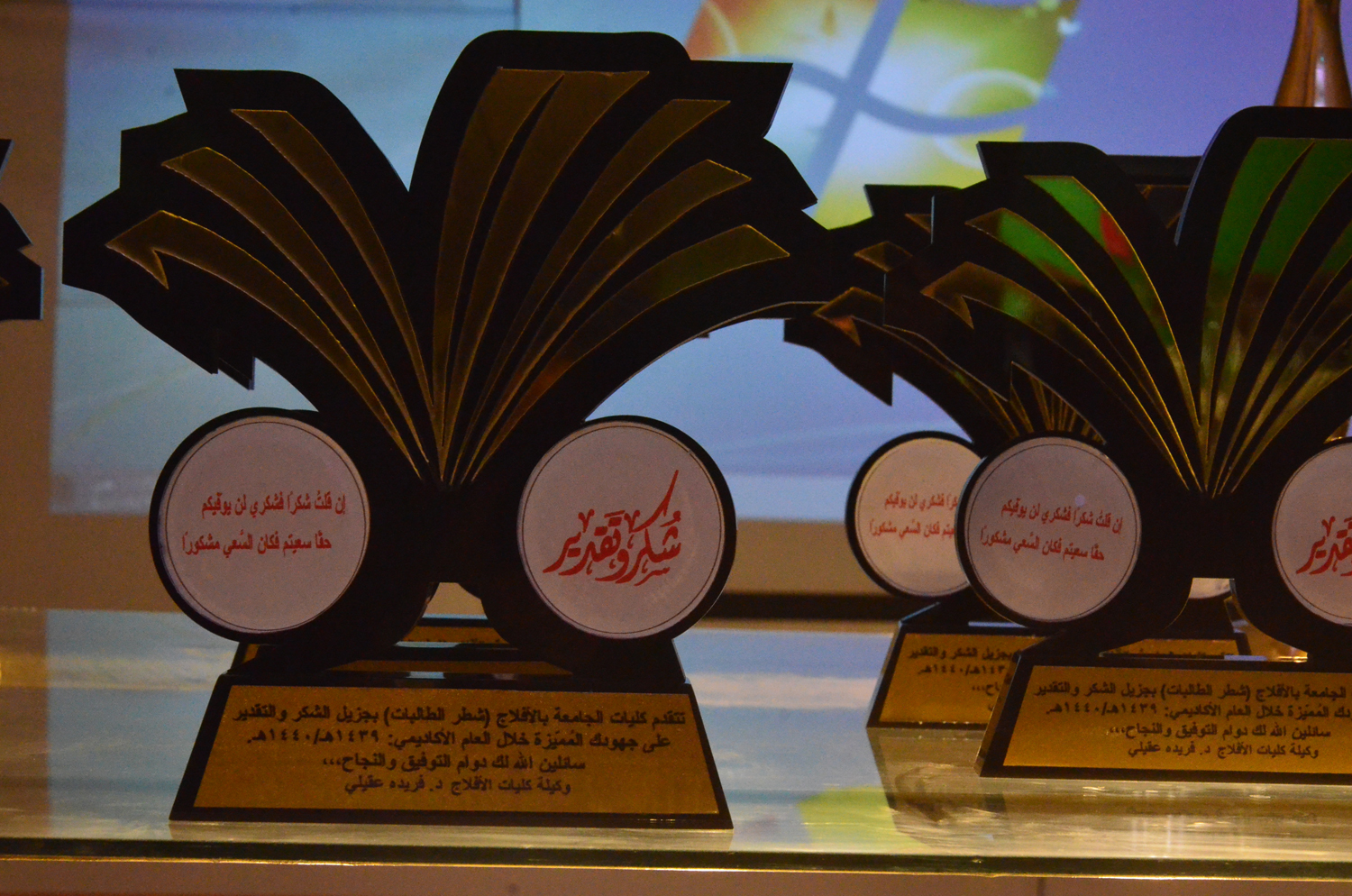 اختتمت كلية العلوم والدراسات الإنسانية بالأفلاج ( شطر الطالبات ) عامها الأكاديمي 1439-1440 هـ بتكريم منسوباتها , برعاية وكيلة الكلية الدكتورة فريدة عقيلي ,حيث اُفتتِح الحفل بالقرآن الكريم تلاه عرض مرئي لإنجازات الجامعة للعام الأكاديمي 1439-1440 هـ من إعداد وحدة التطوير و الجودة , بعده كانت كلمة وكيلة الكلية حيث رحبت فيها بالجميع و أثنت على عطائهم المتميز خلال العام وتمنت لهم دوام التوفيق و النجاح , بعدها كرمت الوكيلة أعضاء هيئة التدريس و مشرفات الوحدات , ثم قامت مساعدة الوكيلة للشؤون الإدارية الأستاذة وصايف المطيري بتكريم الموظفات المتميزات كما كرمت مساعدة العميد للتطوير و الجودة أ.د نادية بعيبن و المشرفة الأكاديمية د.غادة محمد فتحي منسقات الجودة والمشرفات الأكاديميات في الأقسام .
