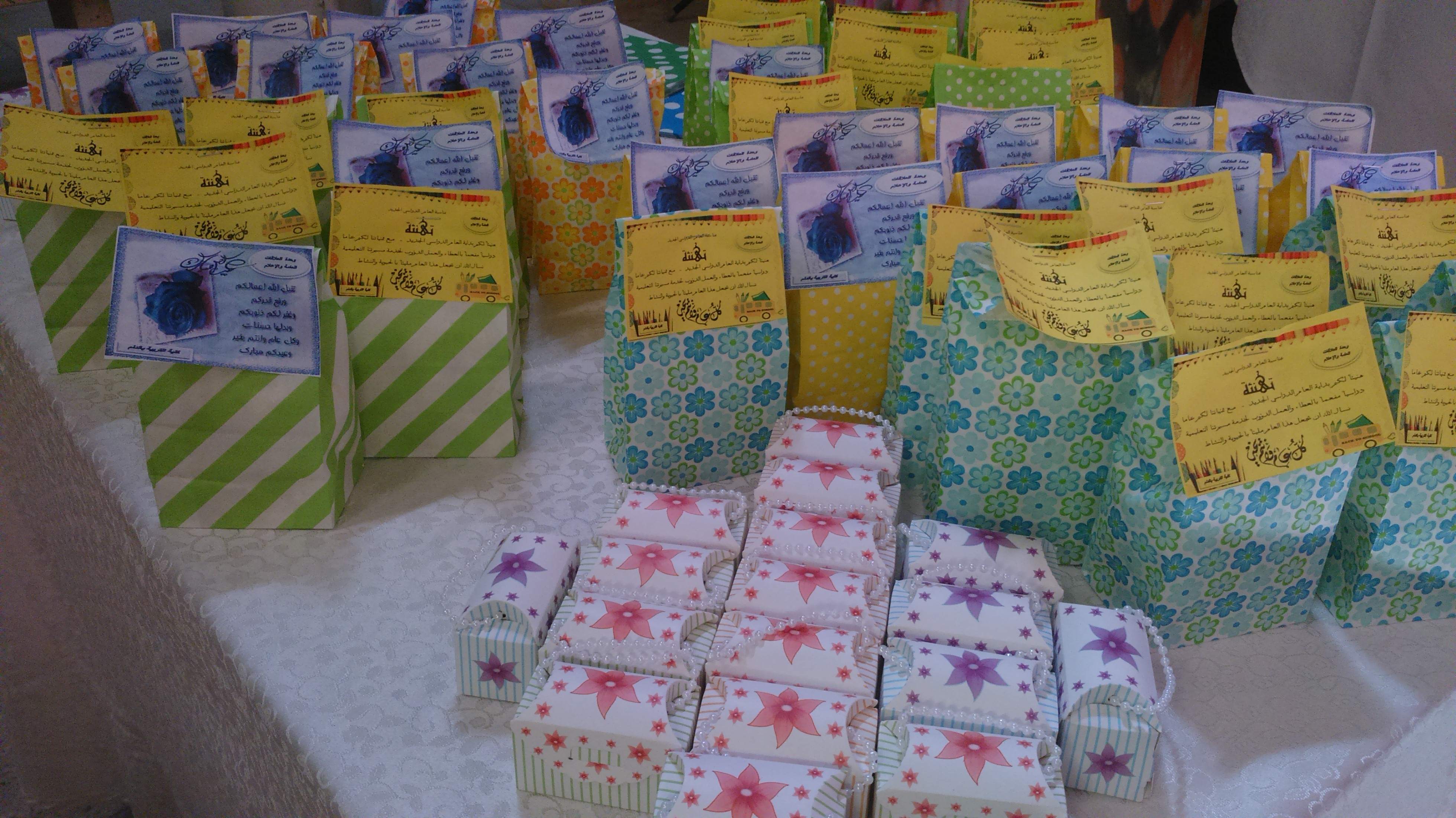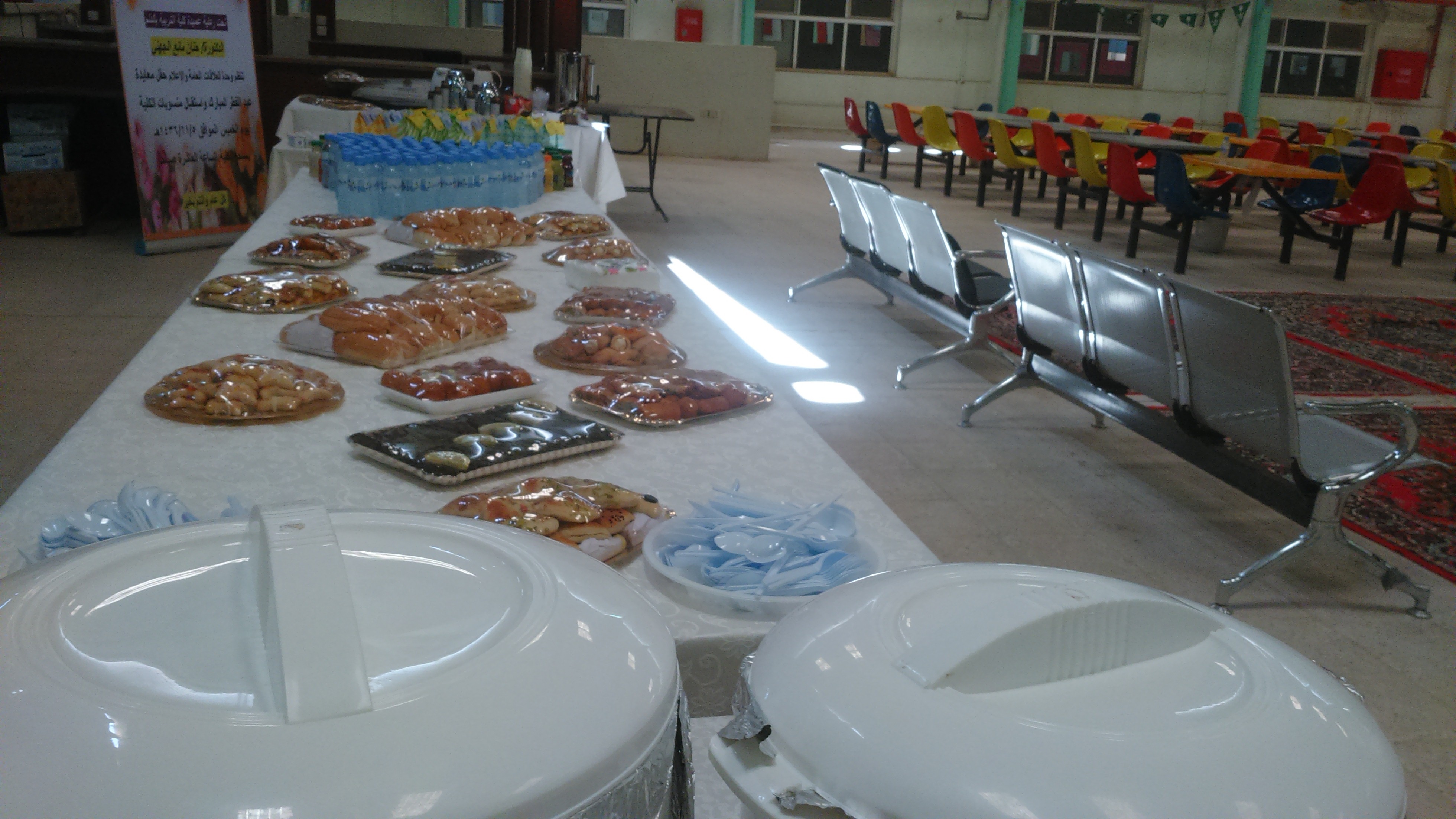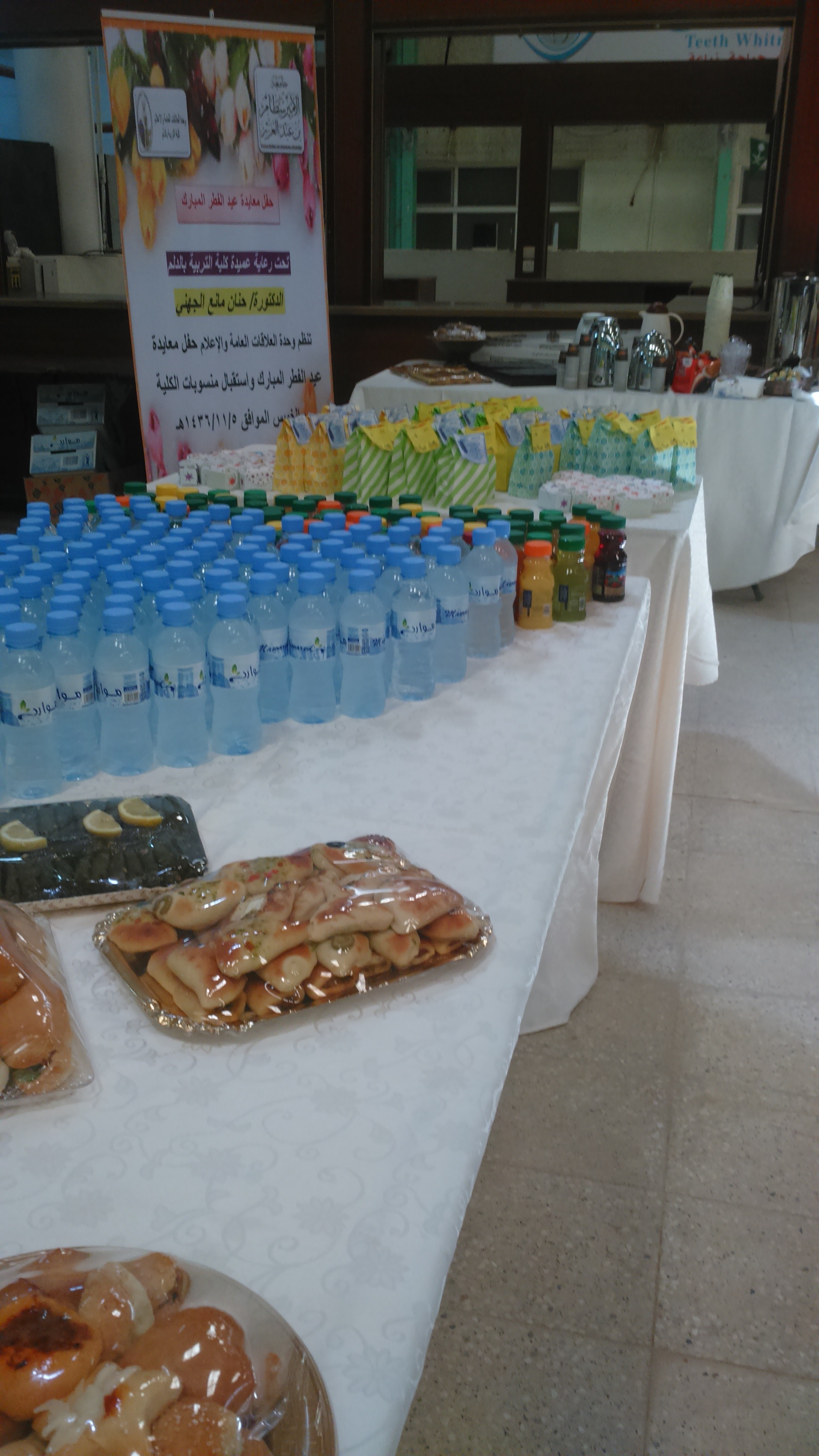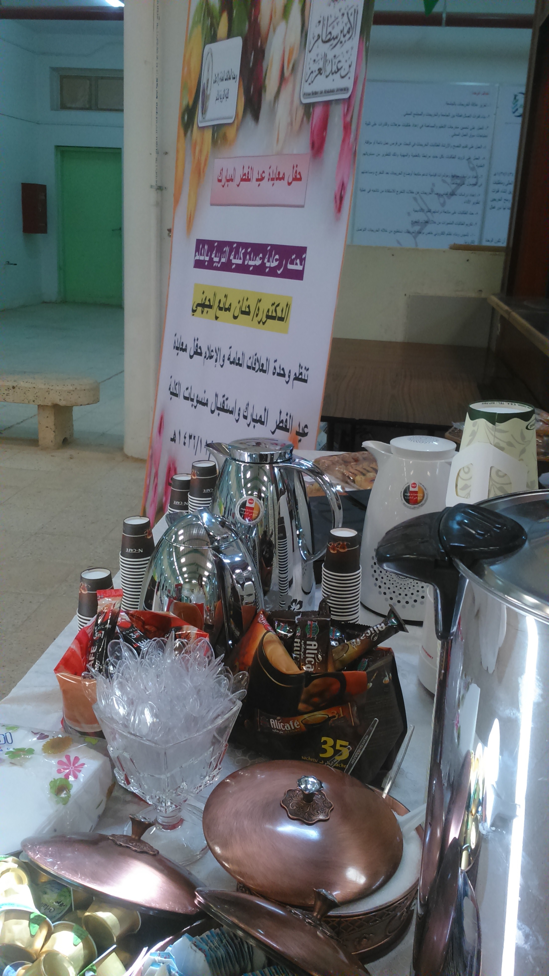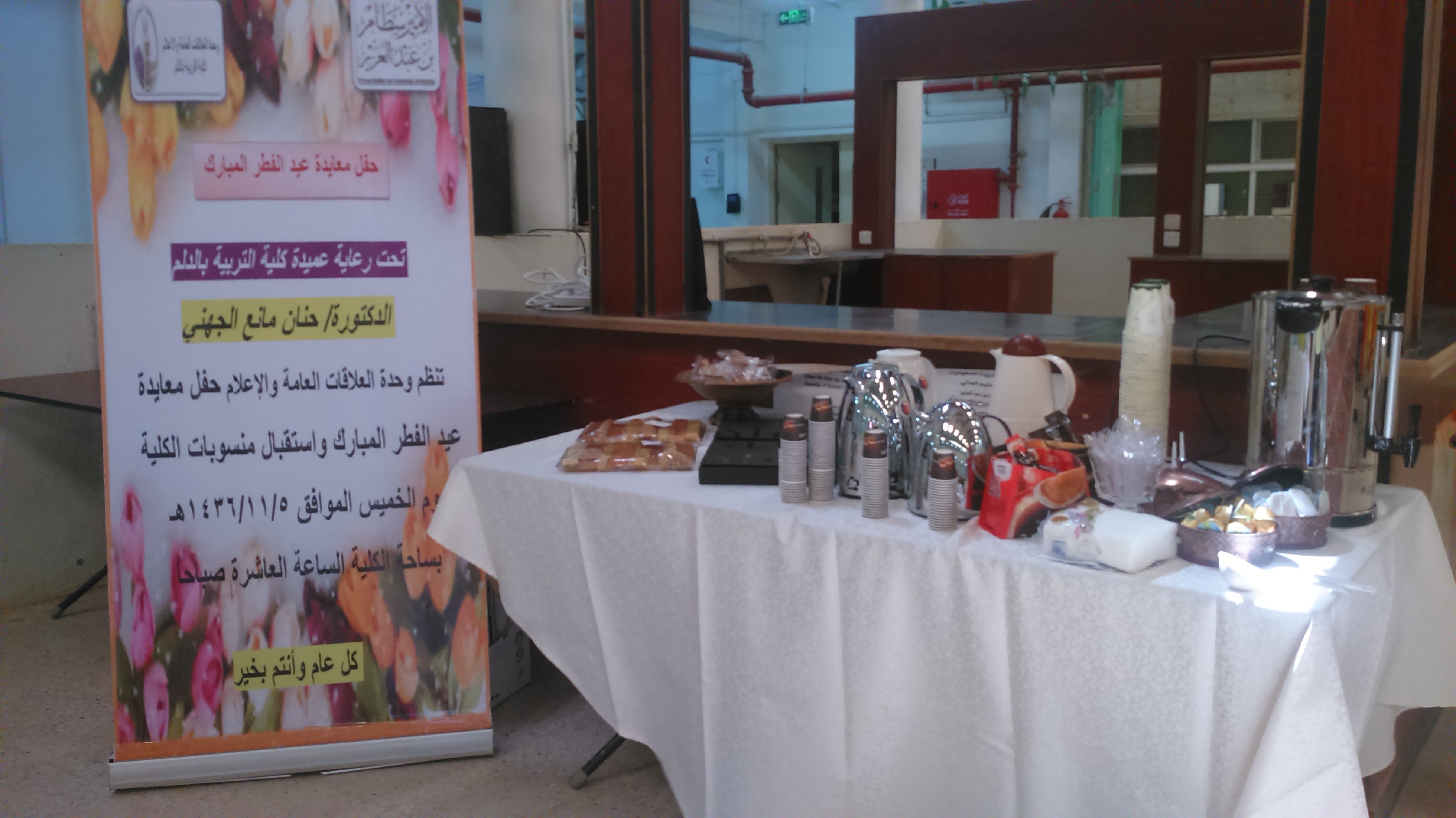 نظمت وحدة العلاقات العامة والإعلام حفل معايدة واستقبال لمنسوبات الكلية يوم الخميس الموافق 1436/11/5هـ الساعة العاشرة صباحاً بساحة الكلية حضره عميدة الكلية الدكتورة حنان مانع الجهني ، ومساعدة العميدة للشؤون التعليمية والاكاديمية الدكتورة سحر عبده ،ومشرفات الأقسام والوحدات ورئيسات اللجان وعدد من منسوبات الكلية من أعضاء هيئة التدريس والإداريات حيث تبادل الجميع التهانئ والتبريك ببداية العام الدراسي الجديد، تلتها كلمة عميدة الكلية الدكتورة حنان مانع الجهني رحبت فيها بالحضور وهنأتهم ببداية العام الجامعي الجديد متمنية للجميع دوام التوفيق والنجاح ،وأثنت على أداء منسوبات الكلية المتميز بكافة المناشط والفعاليات، وتخلل كلمتها بعض التوجيهات القيمة، من أهمها وصيتها بتقوى الله سبحانه وتعالى، وأداء الأمانة نحو الطالبات والمجتمع بهمه وإخلاص، وحثت الجميع على العمل بروح الفريق الواحد ،و بذل مزيد من الجهد والعمل في سبيل الرقي بالكلية لتقف في صدارة كليات الجامعة بأذن بالله.